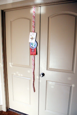 Measure out enough Christmas Ribbon to hang down your door or wall. You can either tape it to the top of a door, like I did (this door never gets opened) or you can make a cute bow to top it off and hang by a hook.