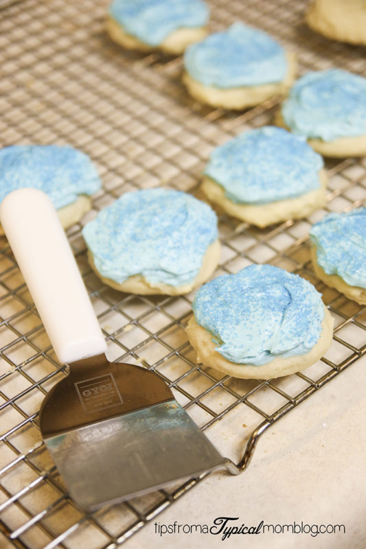 Start out by beating the butter until smooth with a whisk attachment on your beater or stand mixer.  With the mixer still going on medium, add the vanilla and milk and whisk until smooth and incorporated.  Add a pinch of salt while the wet ingredients are mixing.  Turn the mixer to low and slowly add the powdered sugar a little at a time until smooth.  Add powdered sugar until you have reached the desired consistency.  For cookies, I like my frosting pretty thick. Two to tow and a half cups usually works for me.