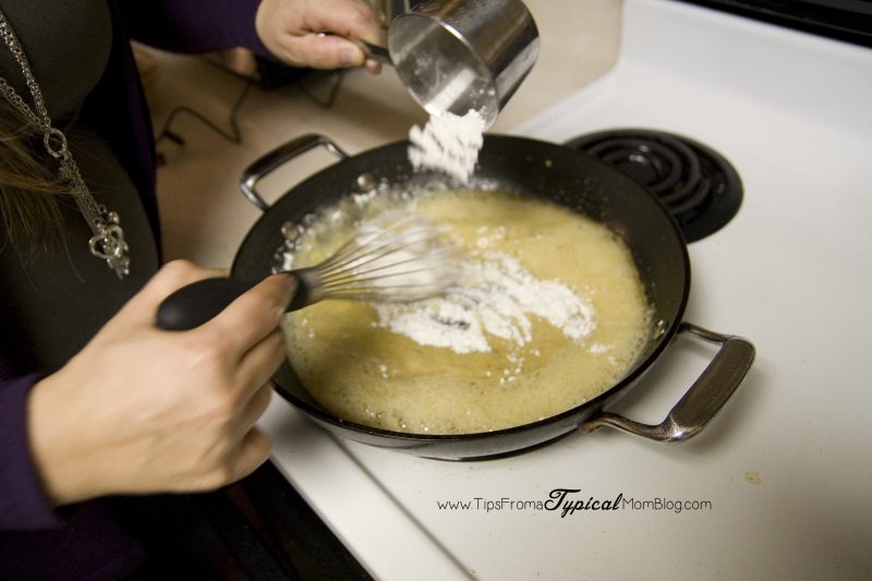 - In small, heavy saucepan melt butter. Add flour and mix well with a whisk. Cook over medium-low heat until mixture bubbles, stirring 2 to 3 minutes to make a roux. The roux should be thick and start to turn a light brown, tan color.