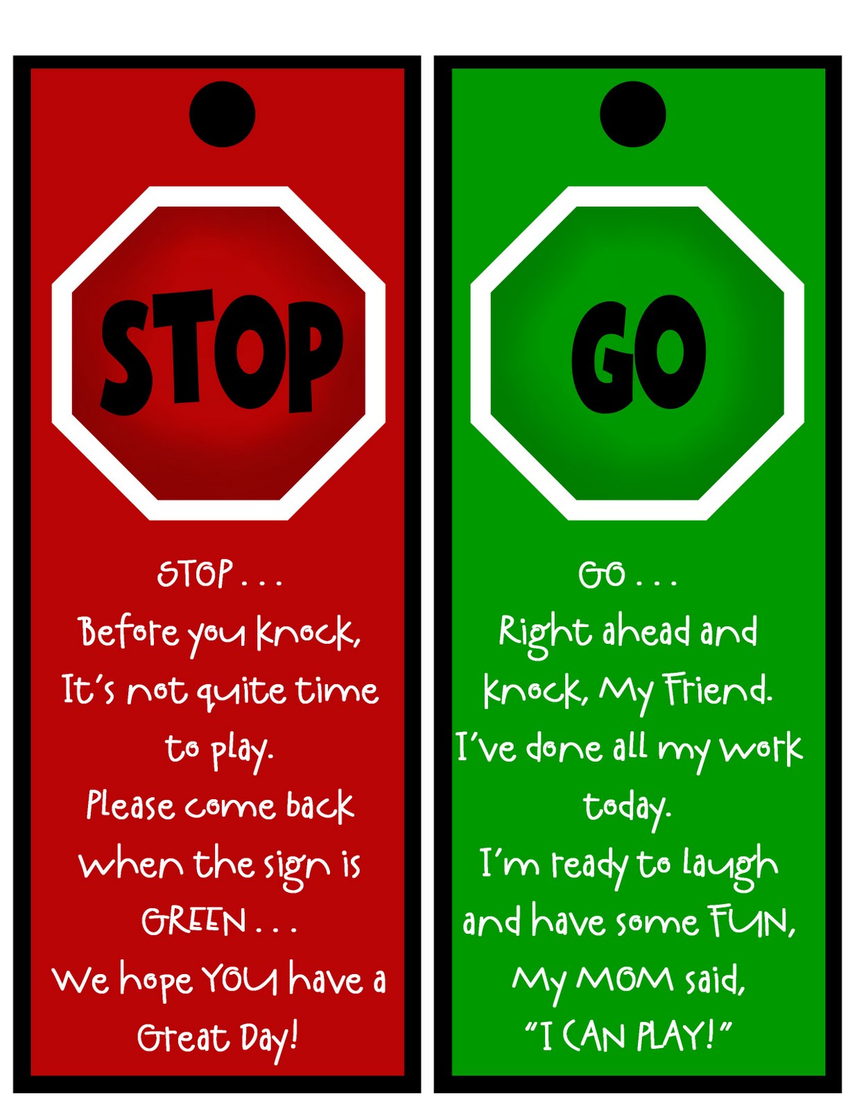 At the Prepared Not Scared Blog, she had such a great idea for keeping the neighborhood kids at bay while your kids are finishing up their morning chores. She made these adorable signs for their door: