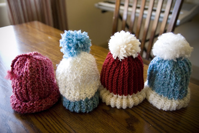 Yes, I know it has been a long time since I have posted something worth while. I blame it all on this pregnancy. It seriously seems like and eternity that I have been pregnant this time, but I know that these next few weeks I have left will go by fast…well, they better. I am ready to see this little guy. He has been keeping me company while the kids have been at school, kicking my ribs and trying to push himself out on his own. Ouch! Anyway, I just wanted to keep in touch and show you one of the things I have been working on now that I’m starting the “nesting” phase of this pregnancy. These cute hats were made using the Knifty Knitter small blue loom. These were made in about 45 min. each! Super easy! My 10 year old daughter made the white with blue rim and pom pom. Check out the knifty knitter here. I have also started crocheting some baby booties, but the first one wasn’t really photo worthy. You can find all sorts of projects on you tube, some really cute stuff! Also, there are a lot of tutorials for the knifty knitter on you tube too! Just search for them. You can make scarfs, pillows, prayer shawls, etc. Lot’s of fun!