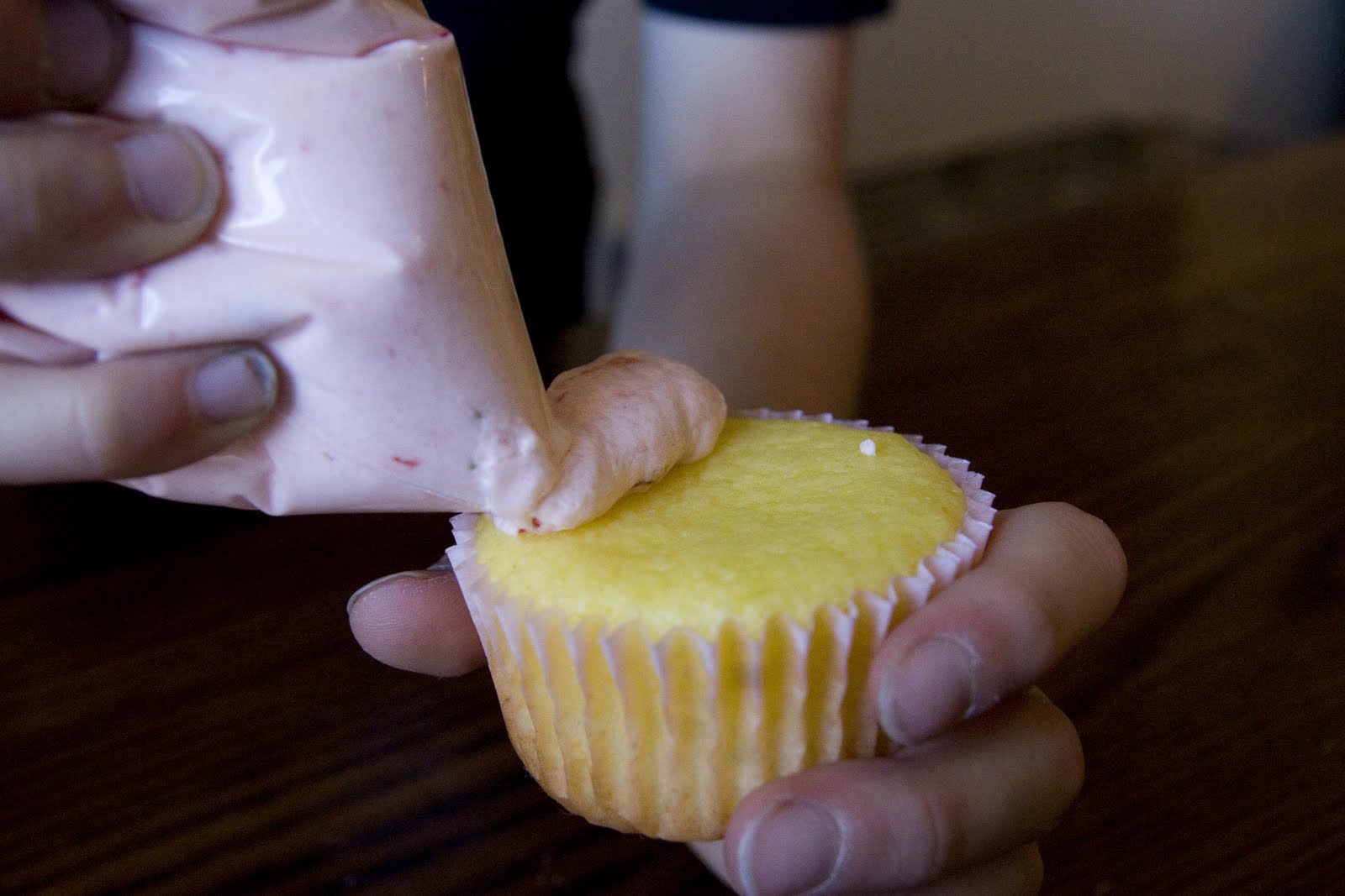 I use a gallon sized zip lock bag with the end clipped off to decorate the cupcakes with. Please don’t look closely at my 12 Year old son’s fingernails in this picture!