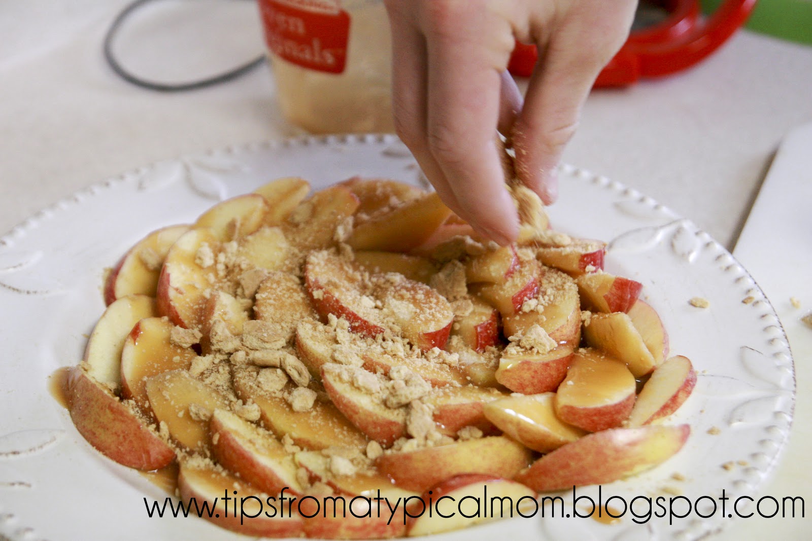Core and Slice the apples, heat up the caramel sauce in the microwave for about 15-30 seconds, just until warm. Sprinkle with the toppings and enjoy!