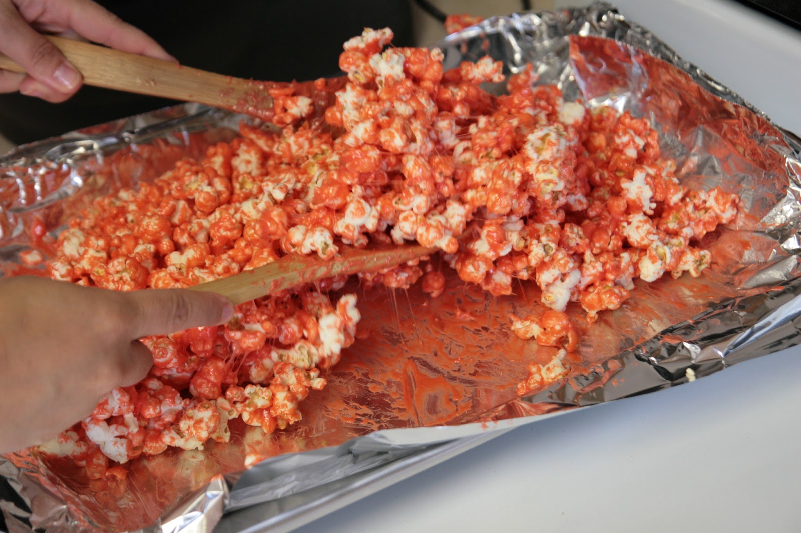 Remove the popcorn from the oven and slowly pour the jello mixture over the popcorn. Using 2 wooden spoons, carefully toss the popcorn until it is coated evenly with the sauce. BE SURE to immediately add water to the pan you cooked the sauce in so it doesn’t become hard. When you are done using the spoons, put them in the water too!