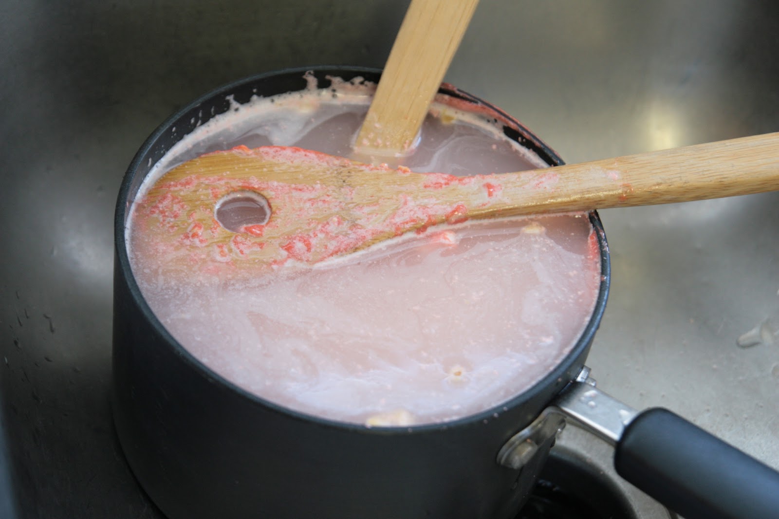 In a medium saucepan, combine the sweetened condensed milk with the jello mix. Cook on medium heat until the mixture starts to thicken (more than it was already). Mine never started to bubble, and when I noticed that it was starting to get clumpy, I stopped cooking it.