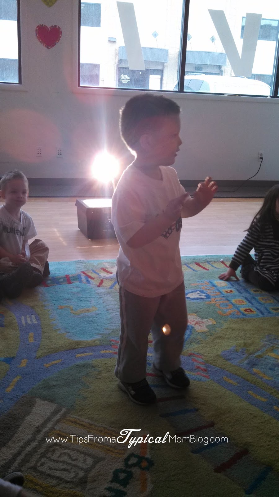 Get a flashlight or even better a projector to shine on a preschool wall. Have the children stand in front of the light and watch their shadow copy them. Have them dance around, move forward and back, and try to make silly shapes with their shadow. We just had the children sit on the rug and watch as they waited for their turn.