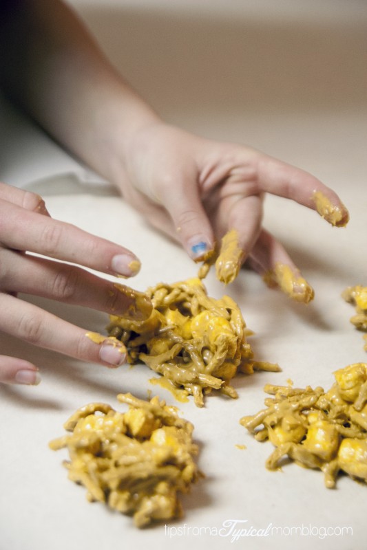 - Drop by heaping tablespoonfuls and shape into nest shapes.