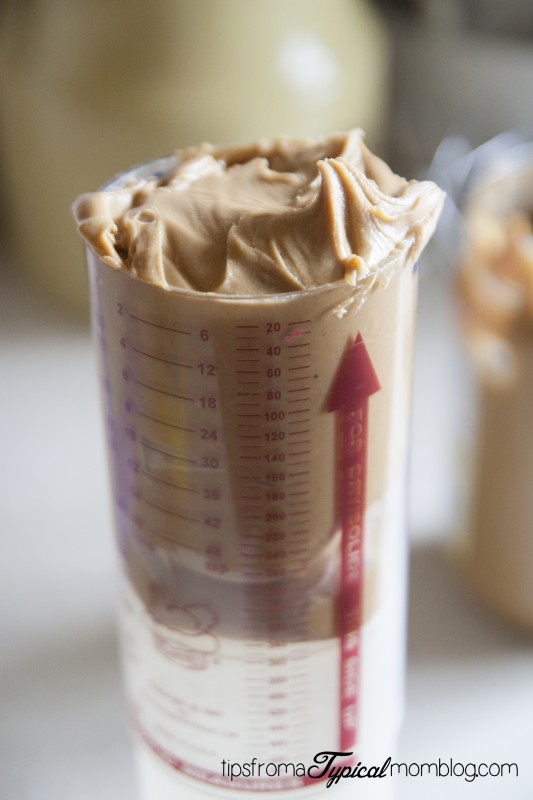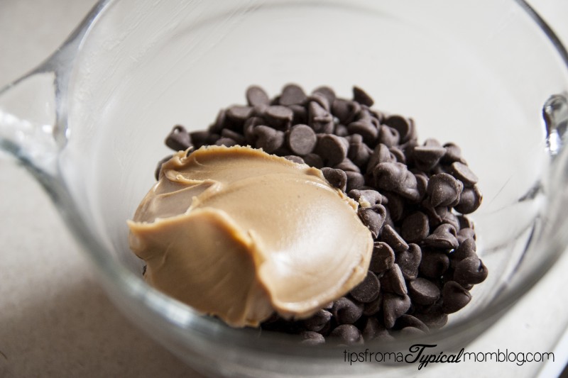 5. Melt the chocolate chips with 2 tablespoons peanut butter at 30 second intervals until melted.