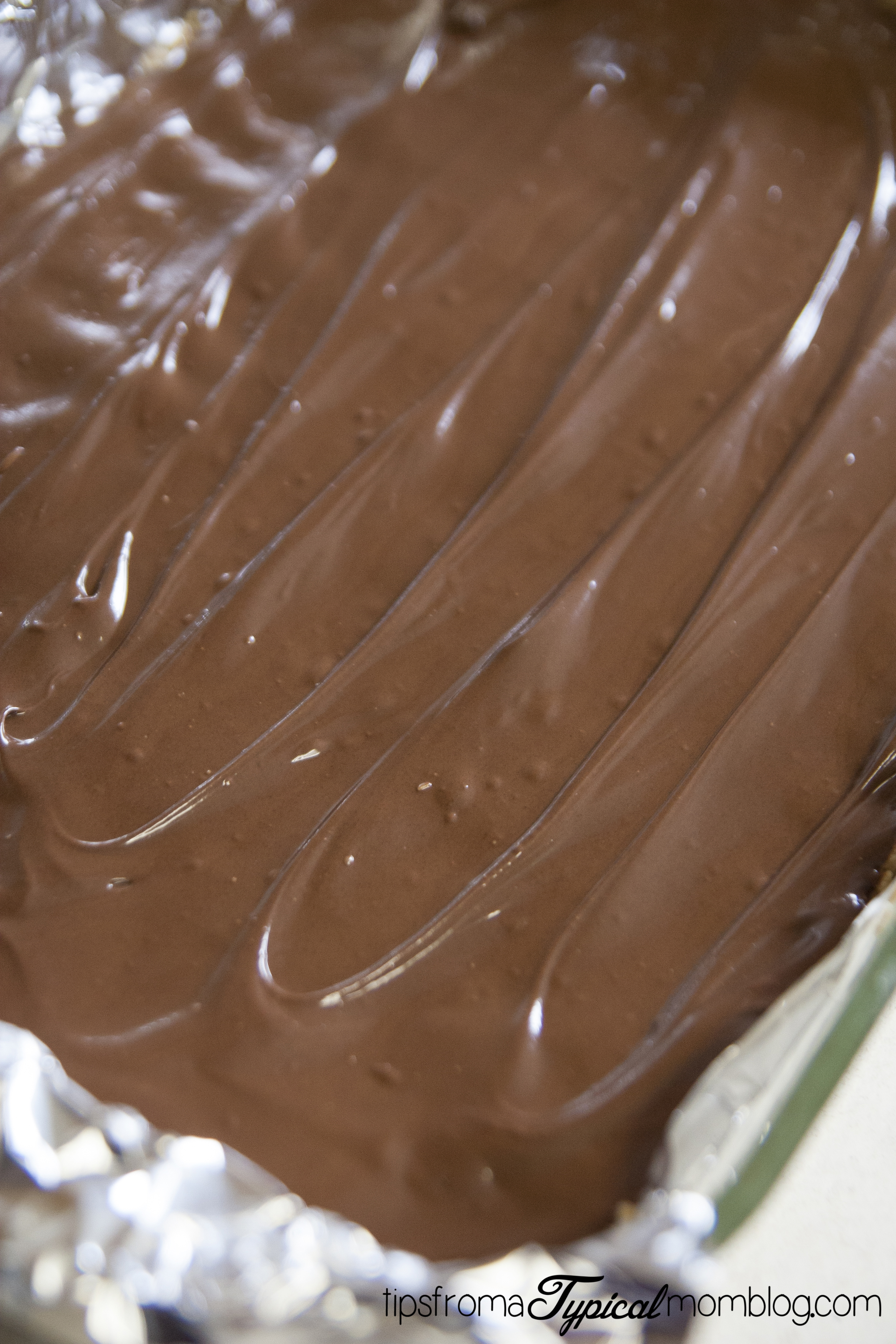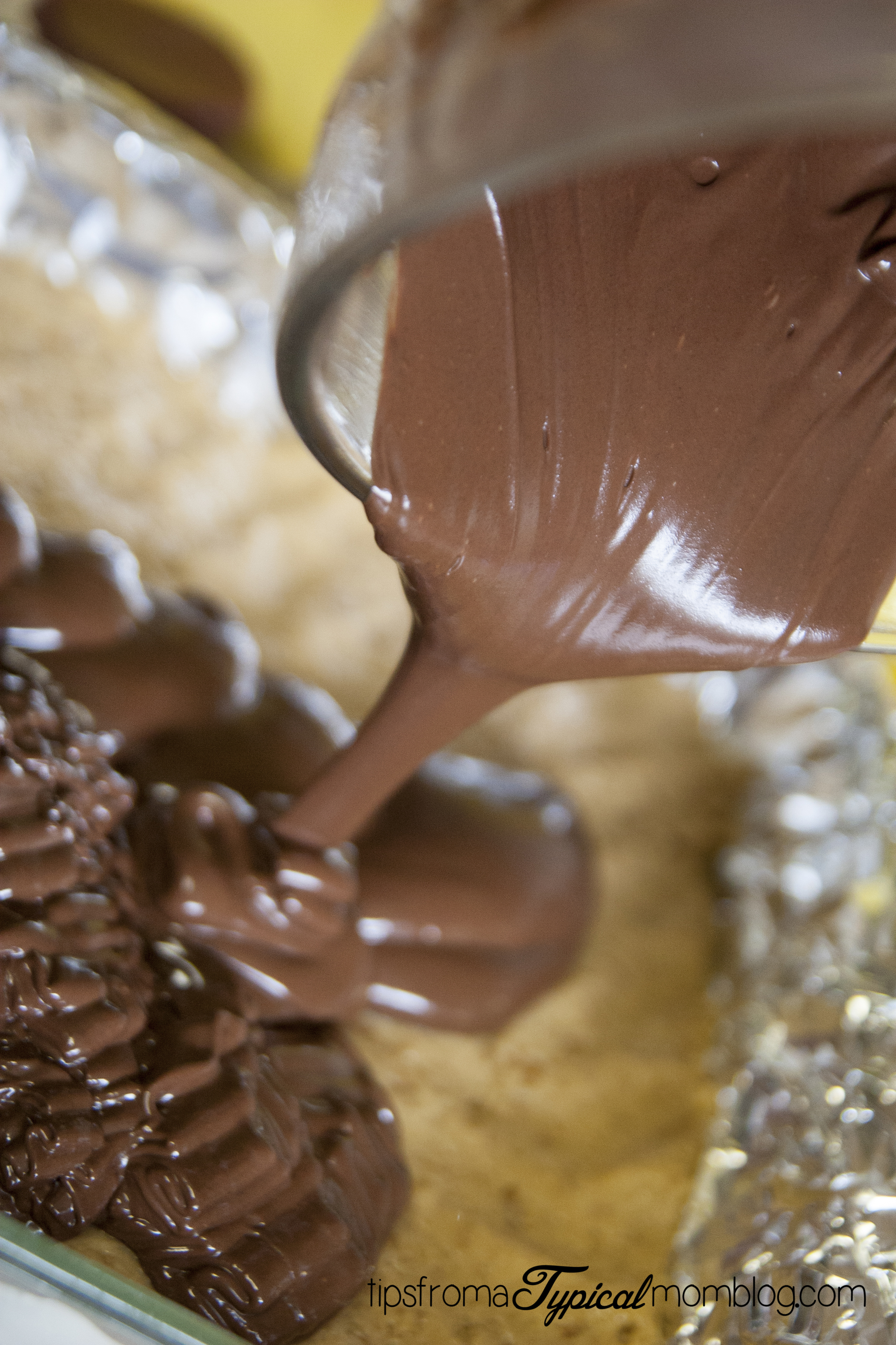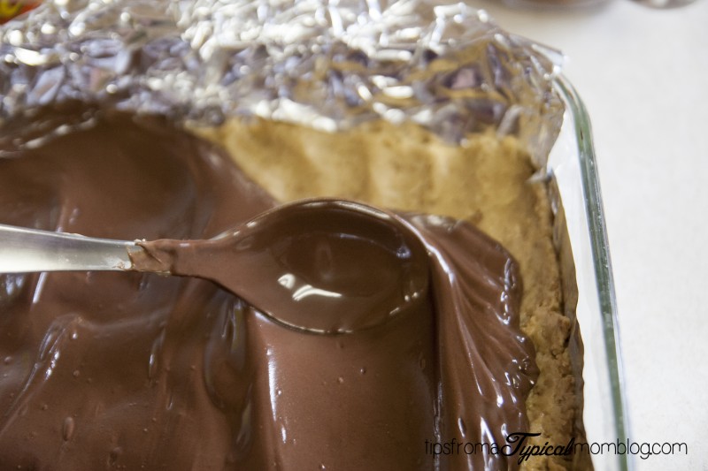 6. Pour melted chocolate over peanut butter mixture and spread in a decorative way.