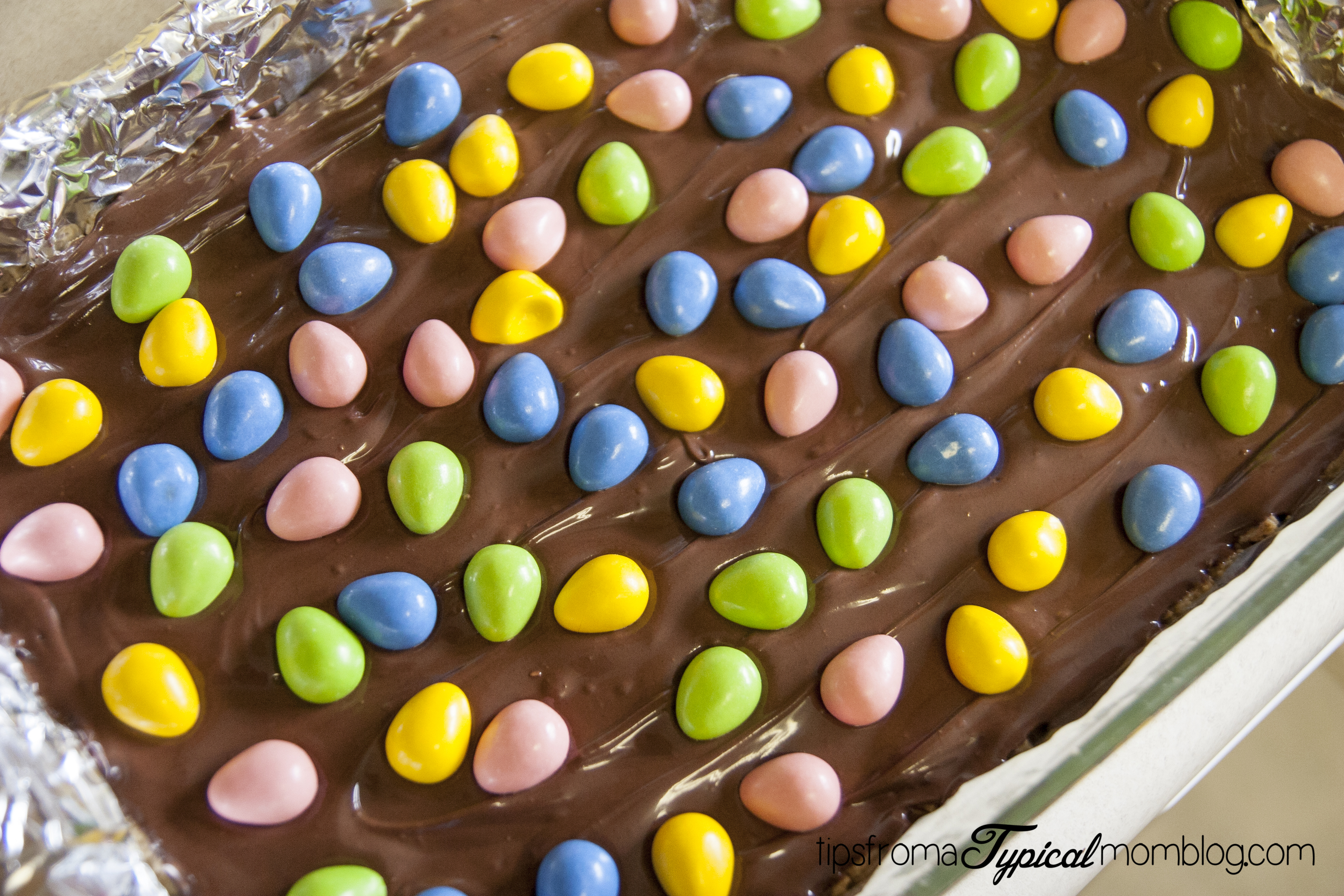 7. Place Easter Egg Candies over the top of the chocolate and lightly press into the chocolate.