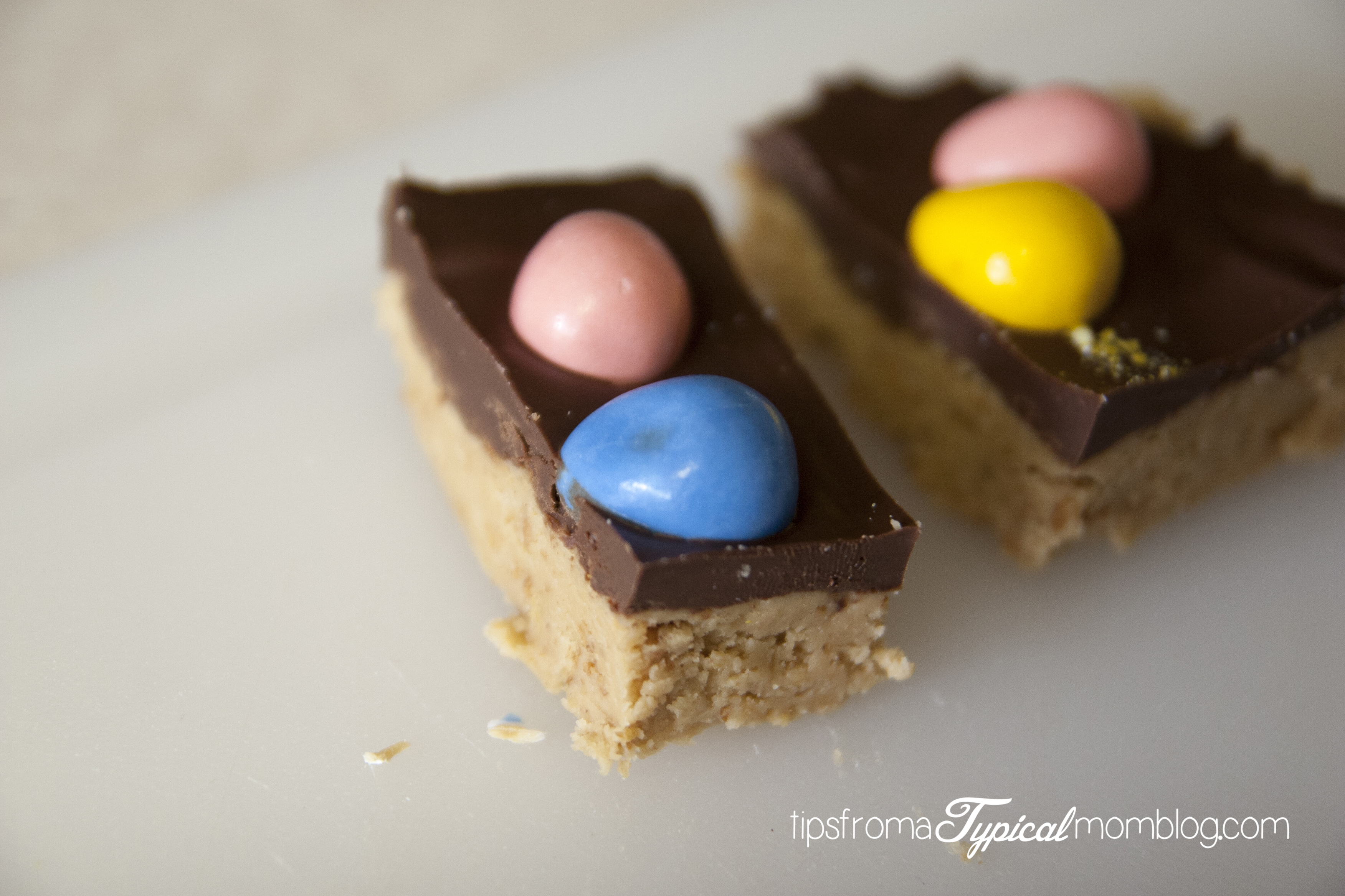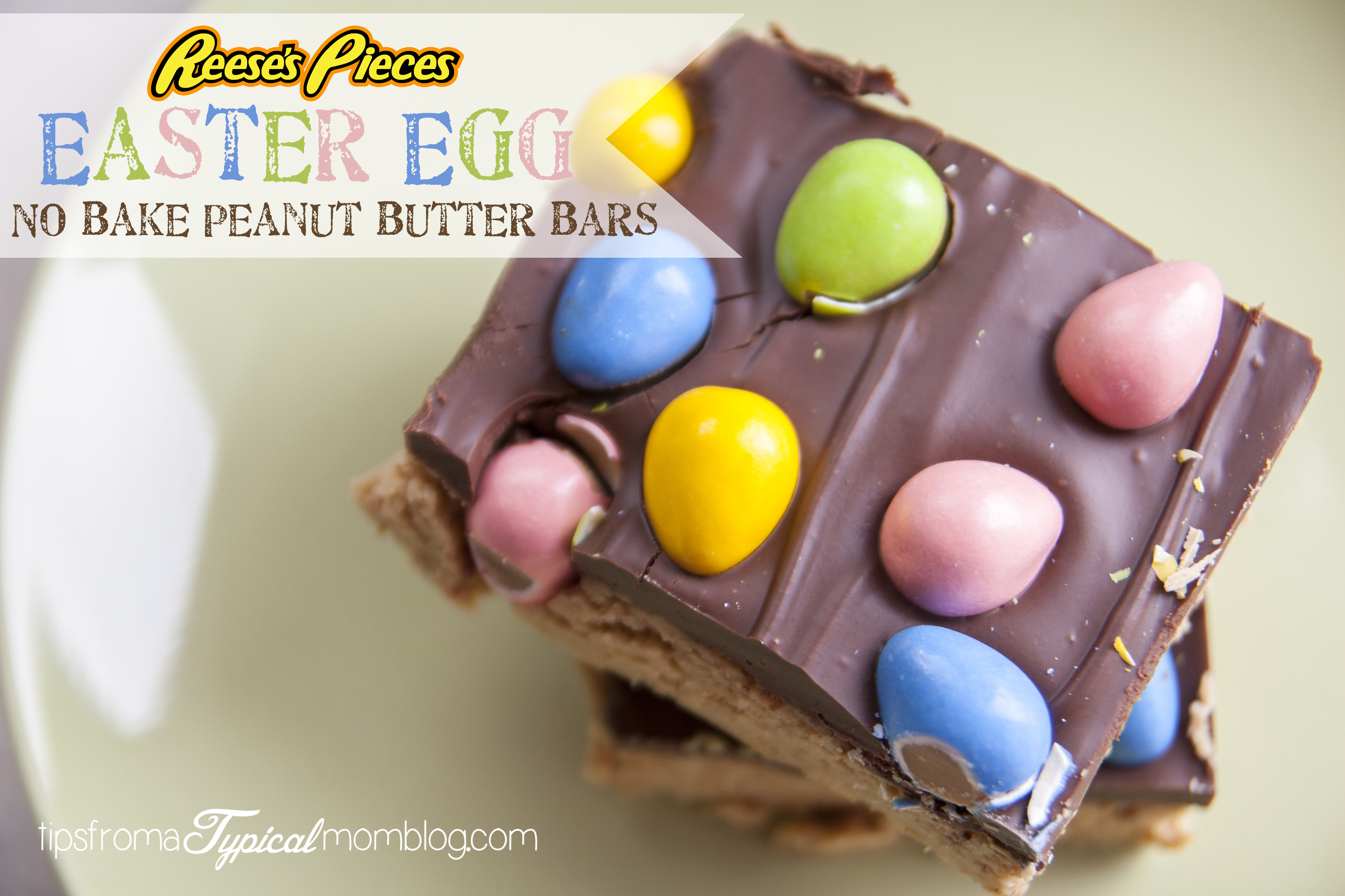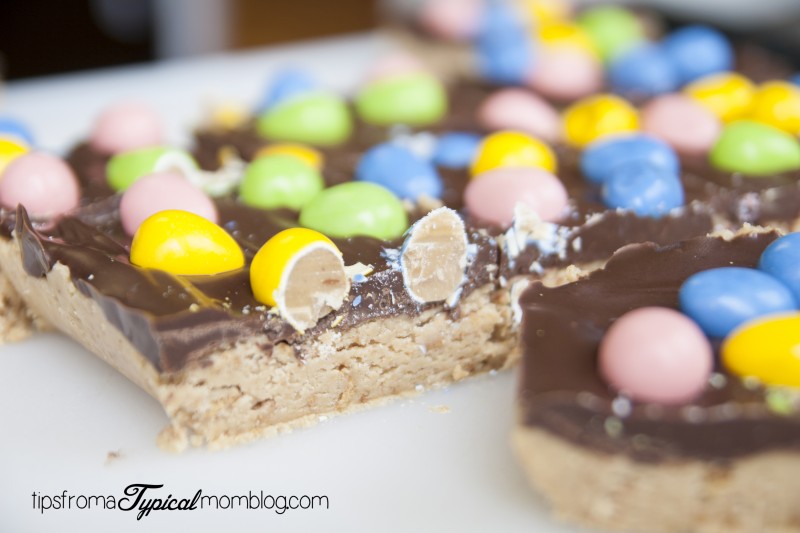 Ok, guys! I have a mouthful for you! Reese’s Pieces Easter Egg No Bake Peanut Butter Bars. Every one of those words needs to be in there to understand how amazingly delicious and rich these are. Yes, I cut way too big of pieces. We had to cut those in half. These are SO easy and SO quick. Take off the Easter Eggs and you have a perfect recipe for Summer. No need to turn the oven on.