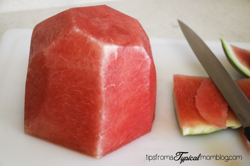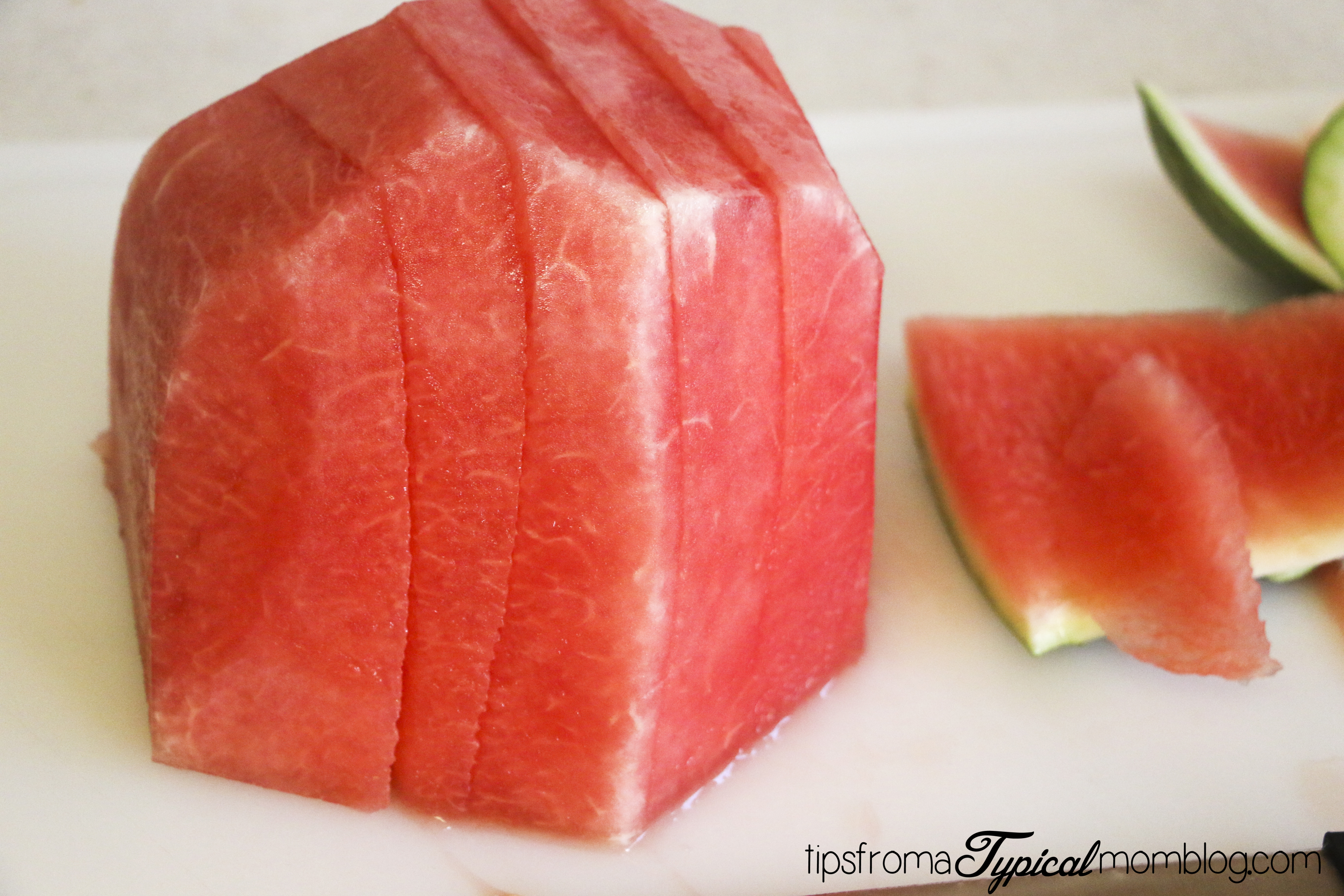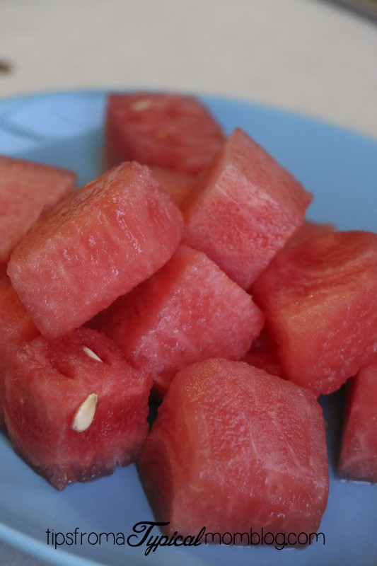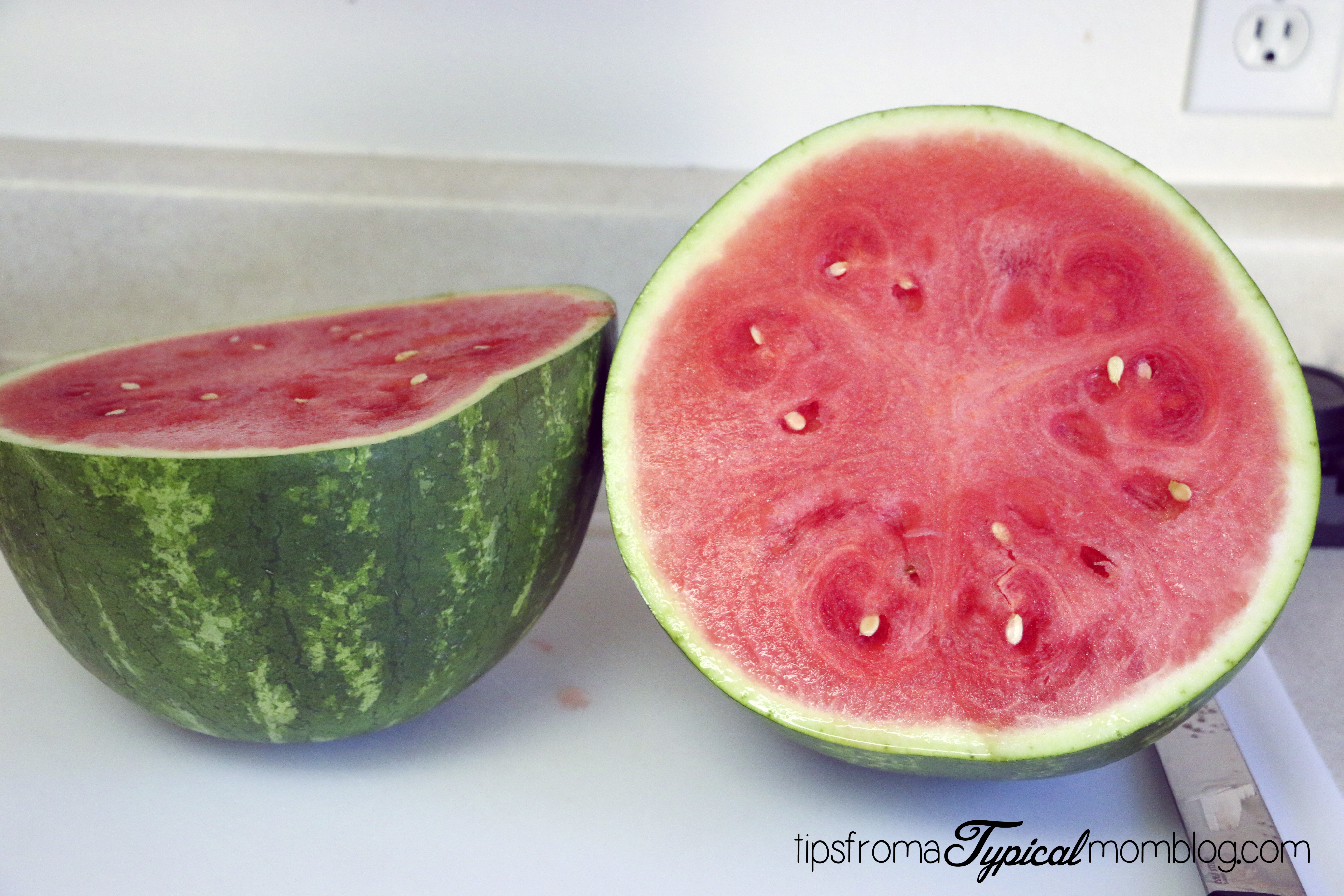 Cutting the watermelon has always been my husbands job around our house because I’m just not as good at using large knifes as he is. He’s had lot’s of experience with large knifes as a precocious boy in scouts. But since my friend taught me how use this method to cut a watermelon, I’ve been doing the job ever since. We were at a Primary Party and it was my job to bring the watermelon. She was watching me try to cut it, without success, when she stepped in and asked me if I wanted to know how she cut a watermelon. I use this method every time! This method is less messy and you can cut the perfect sized watermelon cubes.