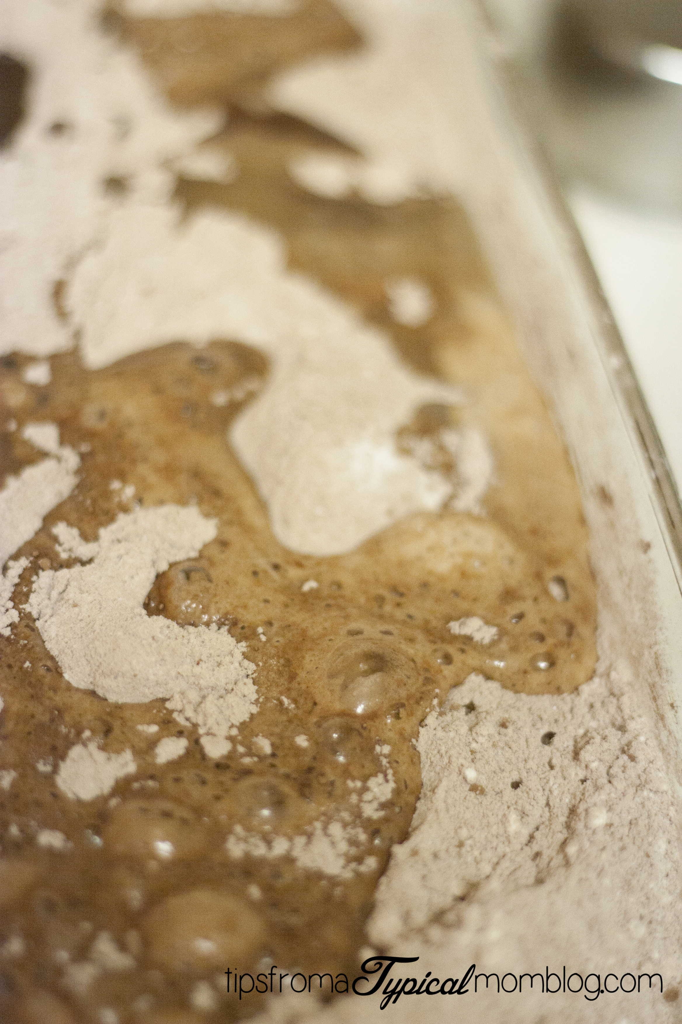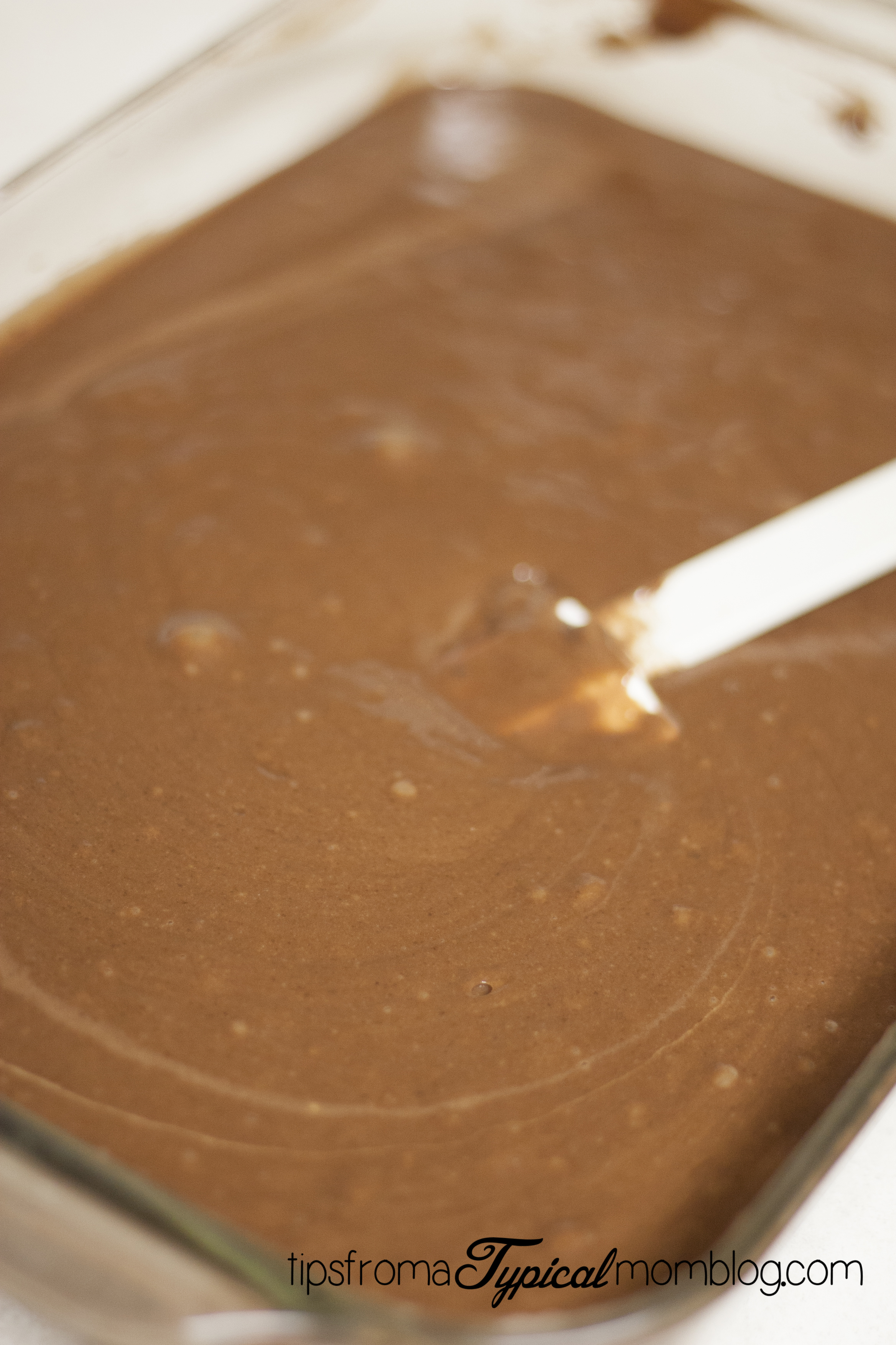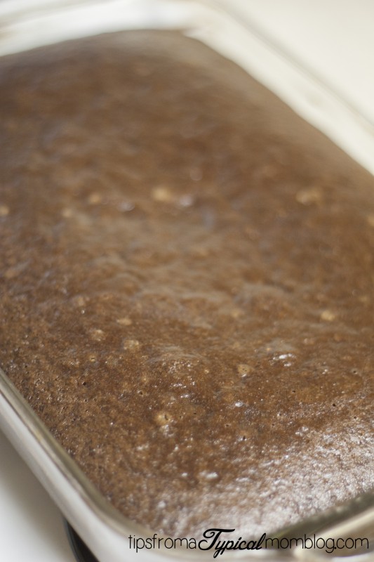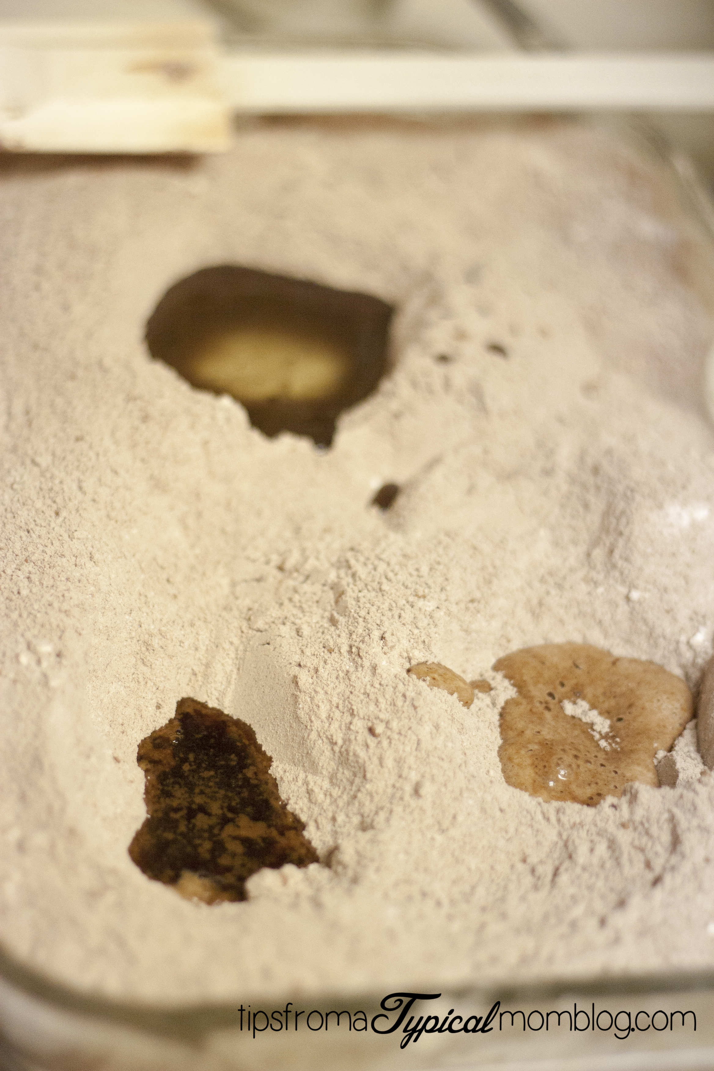 Mix first 5 dry ingredients in a greased 9×13″ baking pan.
