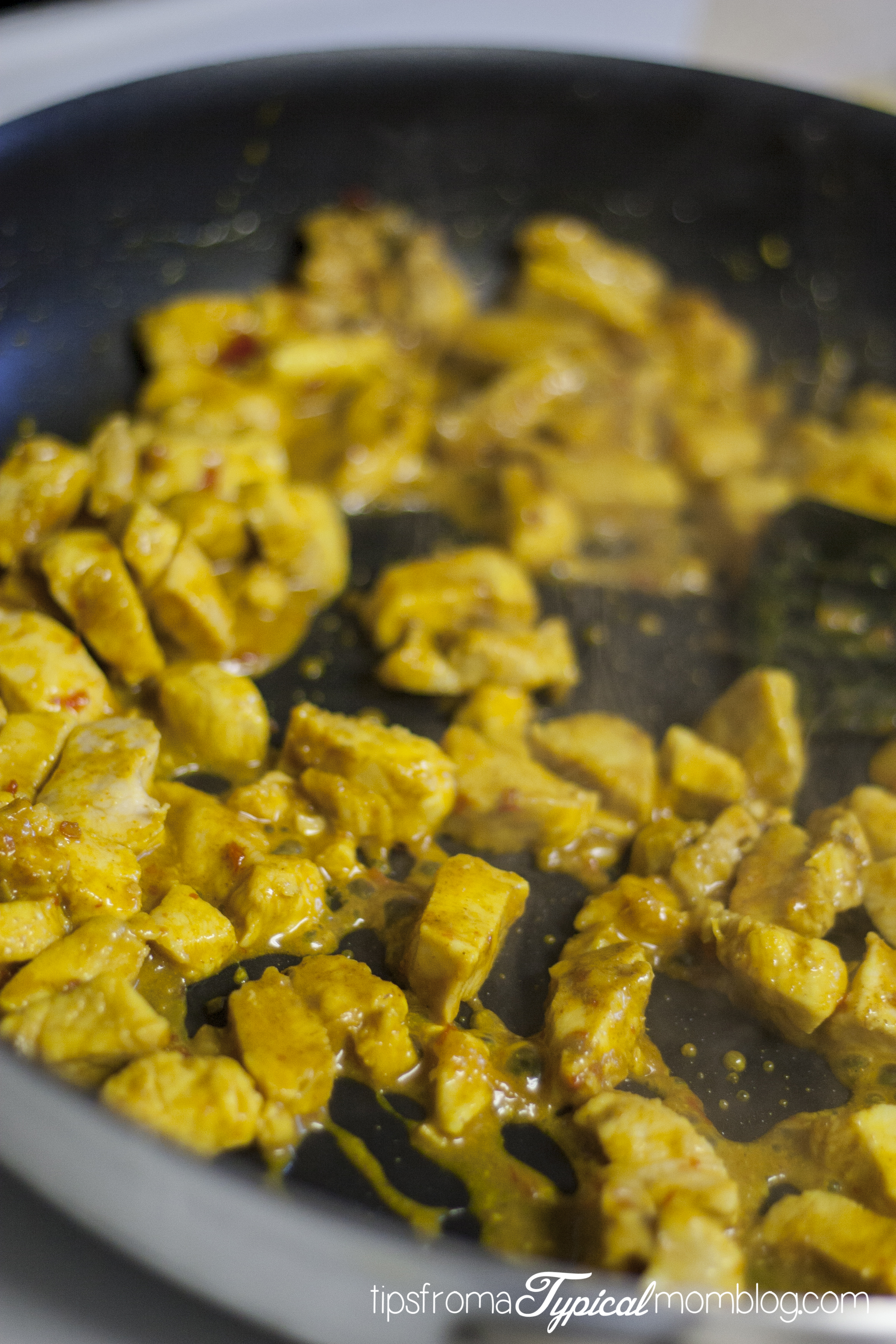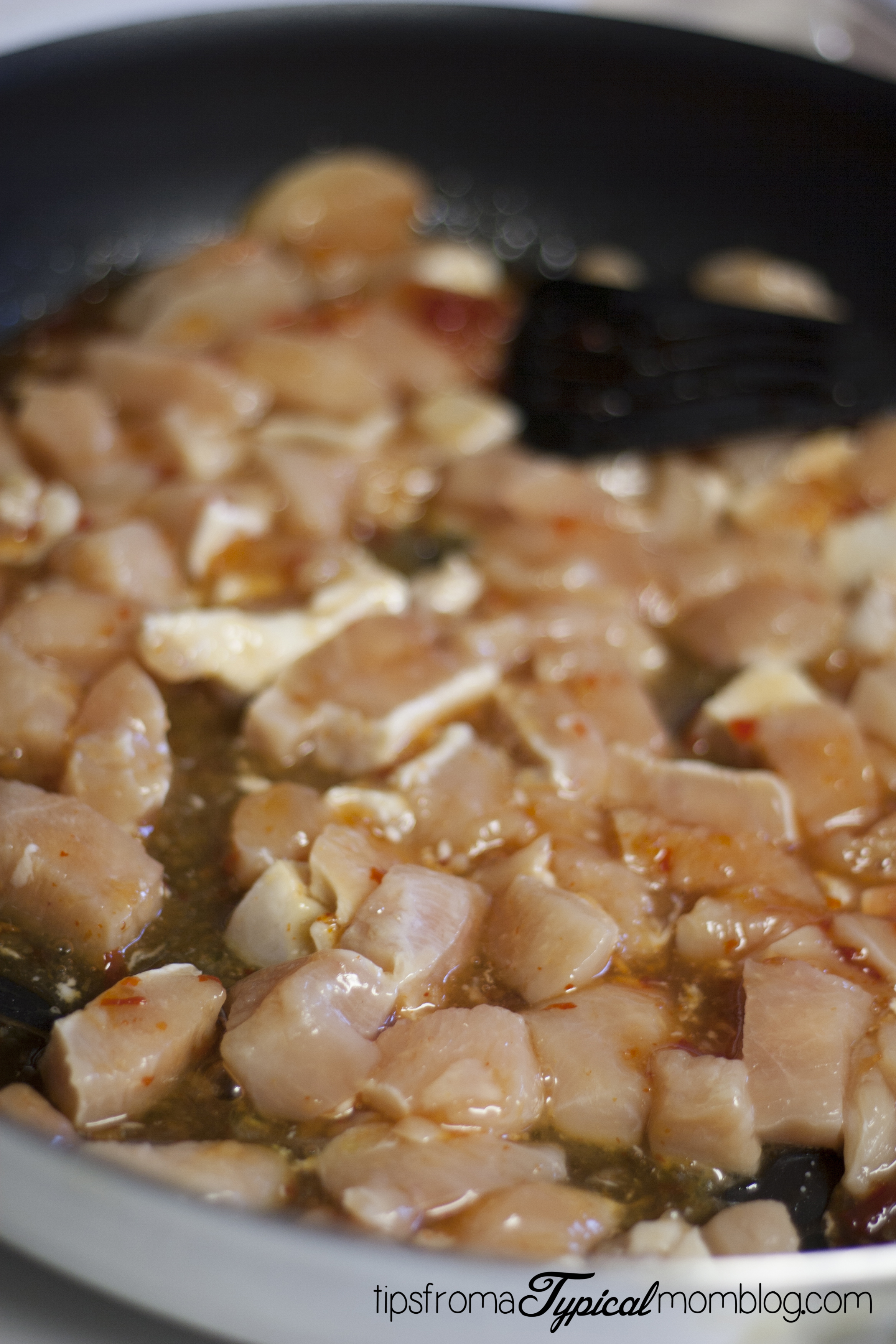 - Over medium heat in big frying pan, add olive oil and let heat up. Add chicken and stir. Add chili sauce and cook until chicken is done (about 10 min). (the more undisturbed the chicken is, the more browned it gets)