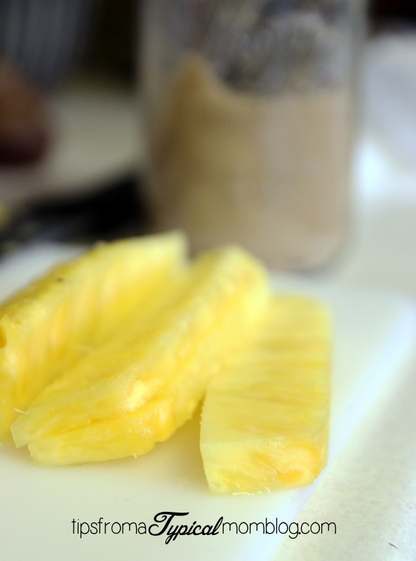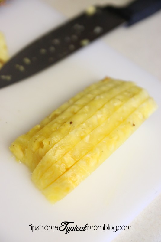 Start out by slicing a fresh pineapple into about 1/2 inch long slices.