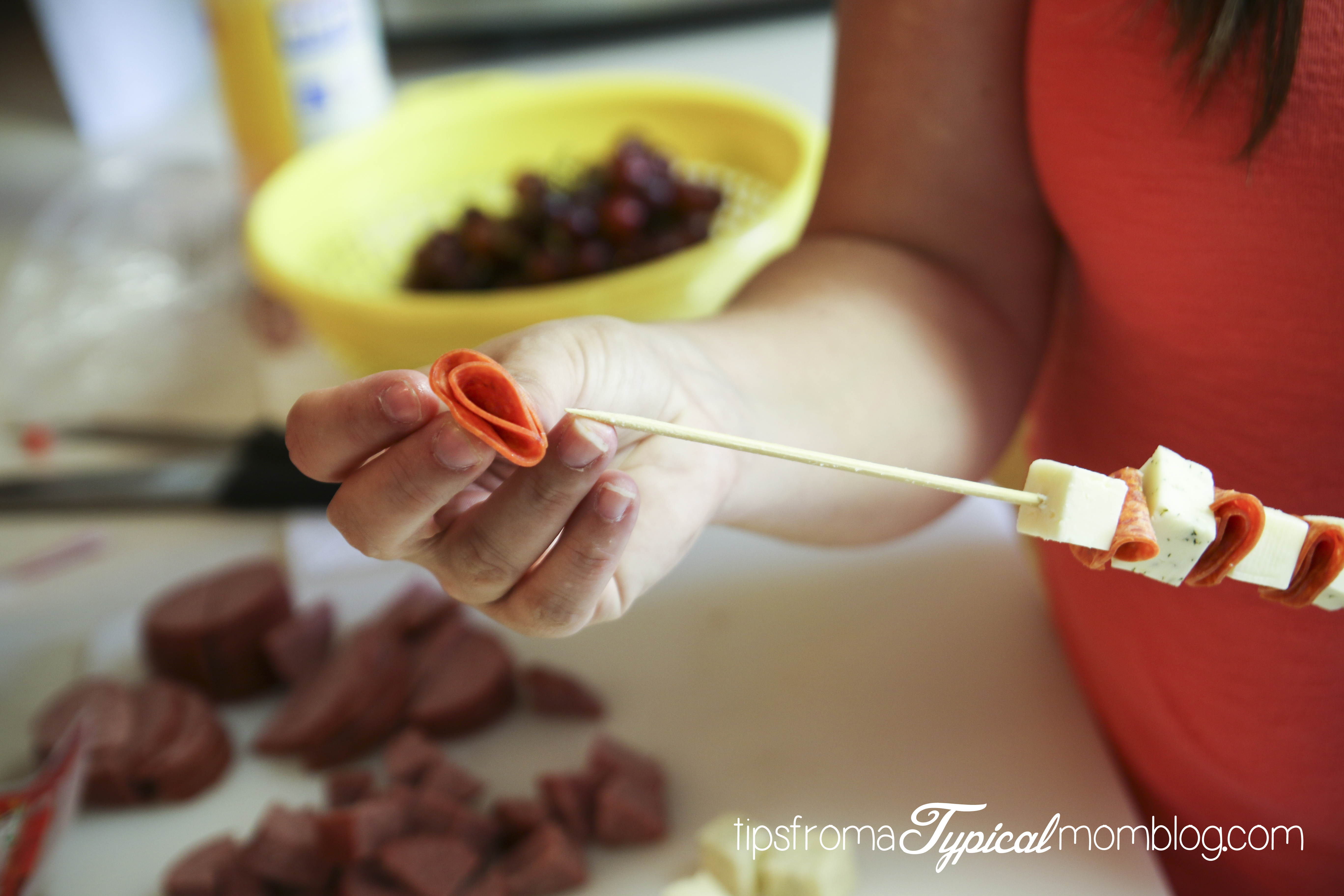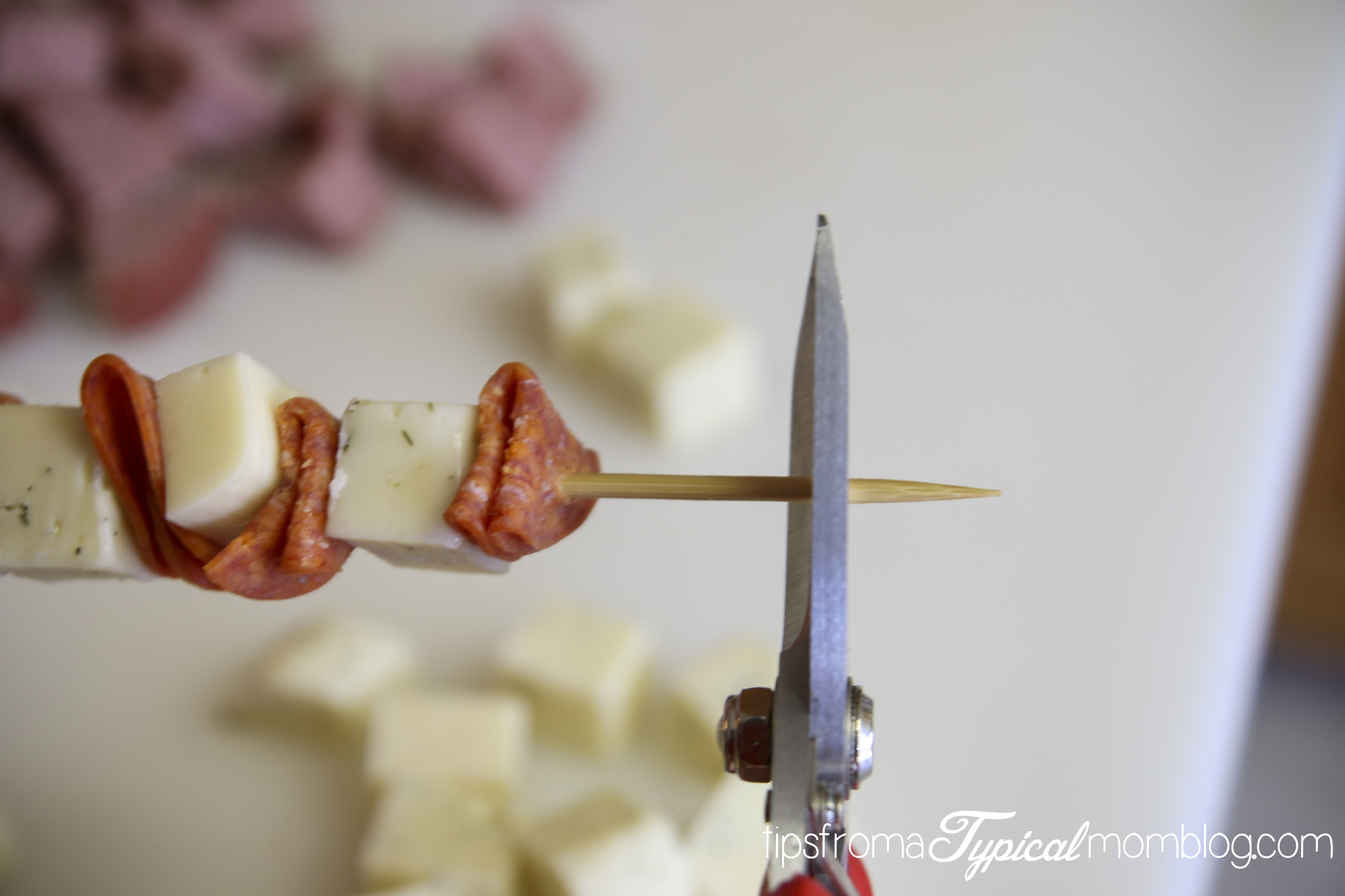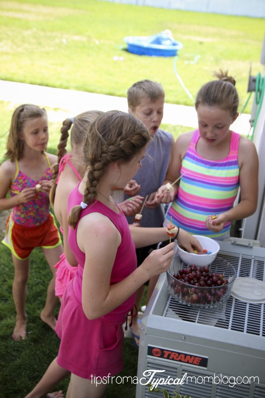 And so on and so forth until you’ve made the perfect skewers. I thought the kids wouldn’t want to eat a whole skewer, so I cut them in half and cut the sharp end off of them when I was done with sturdy kitchen scissors.