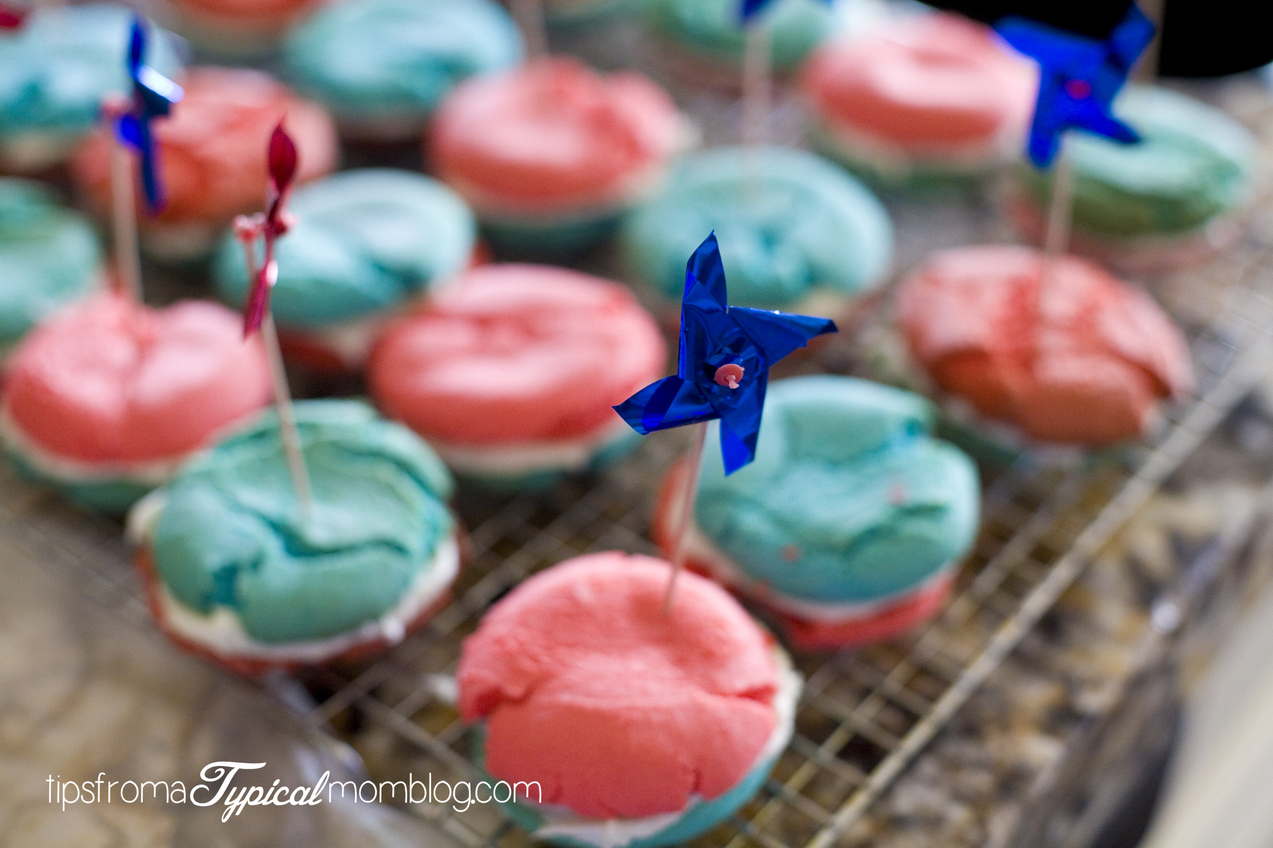 Now take a red cookie, frost the bottom of it then press the bottom of a blue cookie into the frosting and you’re done! So easy! I added some little Red and Blue Pin Wheels for some added cuteness. When you display the cookies have some red sides up and some blue sides up.