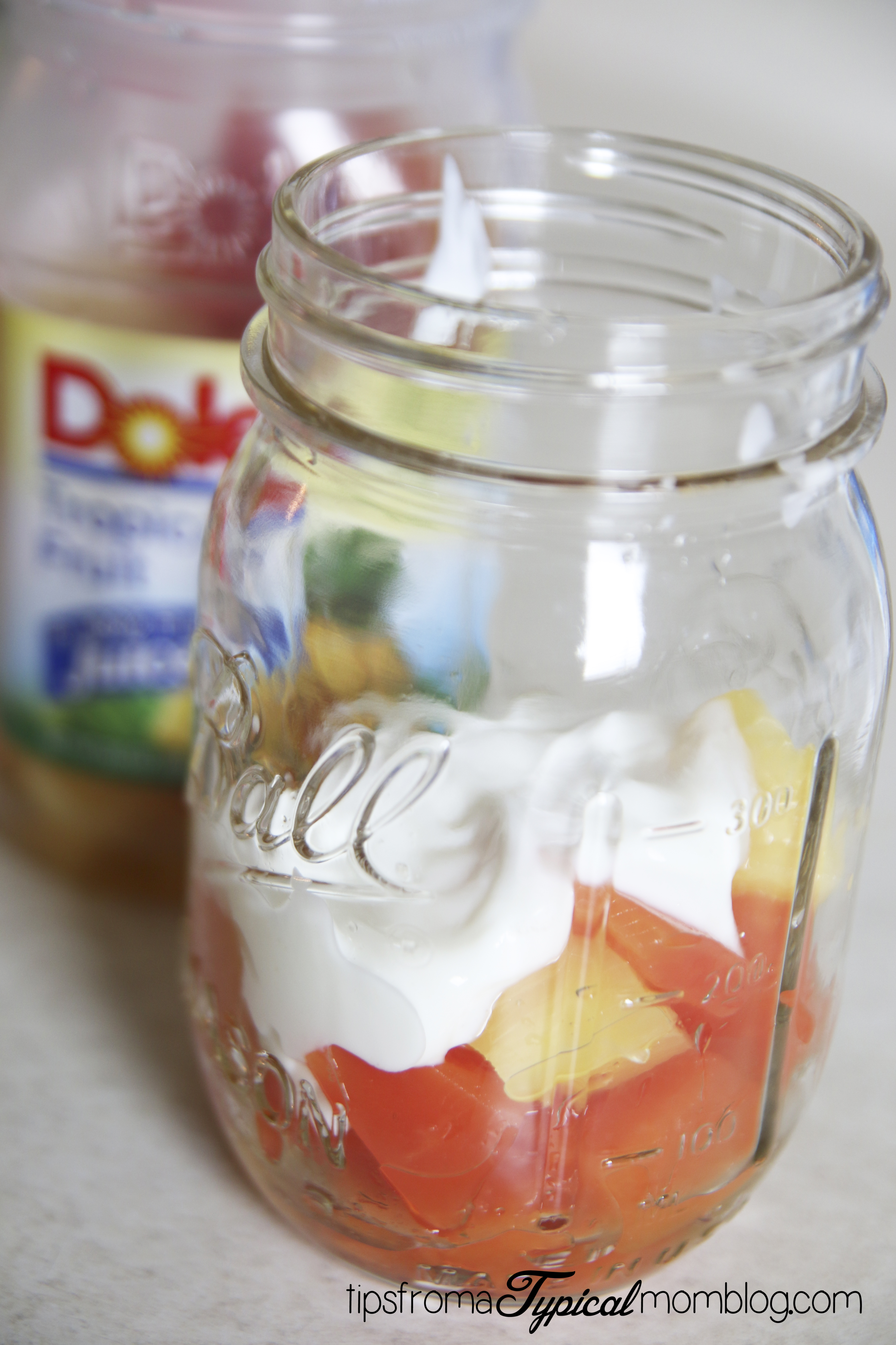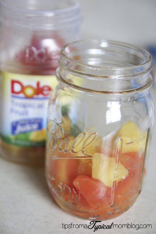 Now open the DOLE Tropical Fruit and drain the juice. You can drain it into a cup and drink it because DOLE Fruit in Jars are packed in 100% real juice. My kids love drinking the juice.