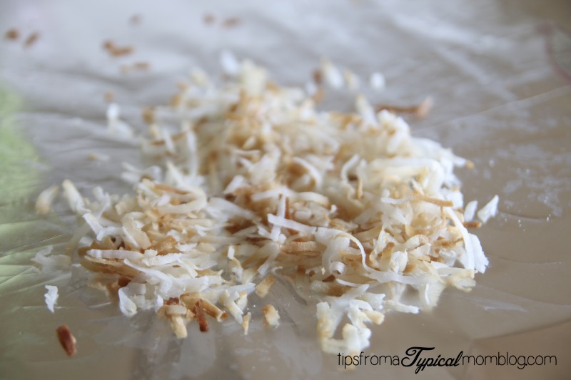 Put it in the oven for about 3-5 minutes. Keep checking it often so it doesn’t burn. Remove when most of the coconut is browned.