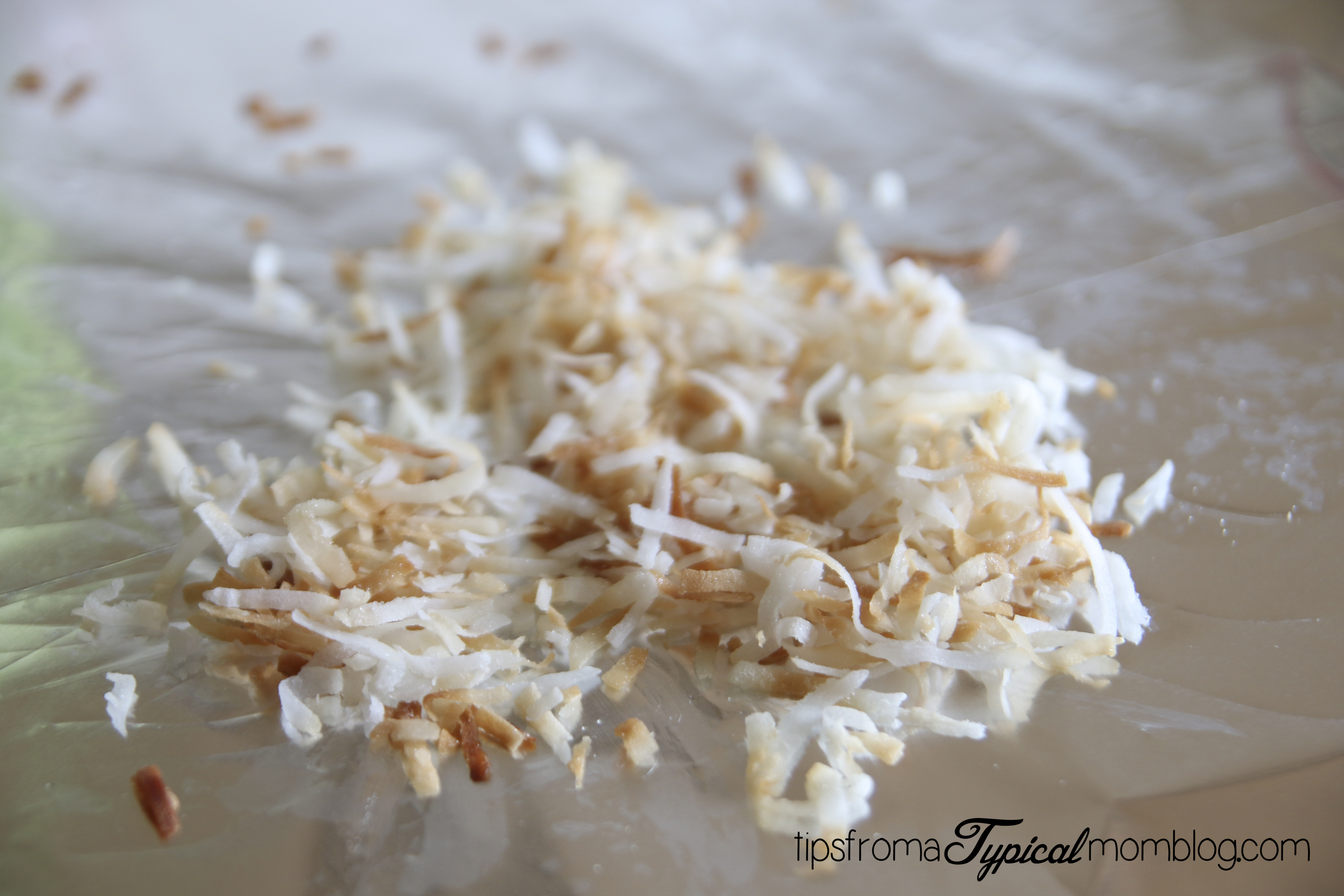Start out by toasting the coconut. Preheat the oven to about 400 degrees. Spread the desired amount of coconut on a piece of tin foil.