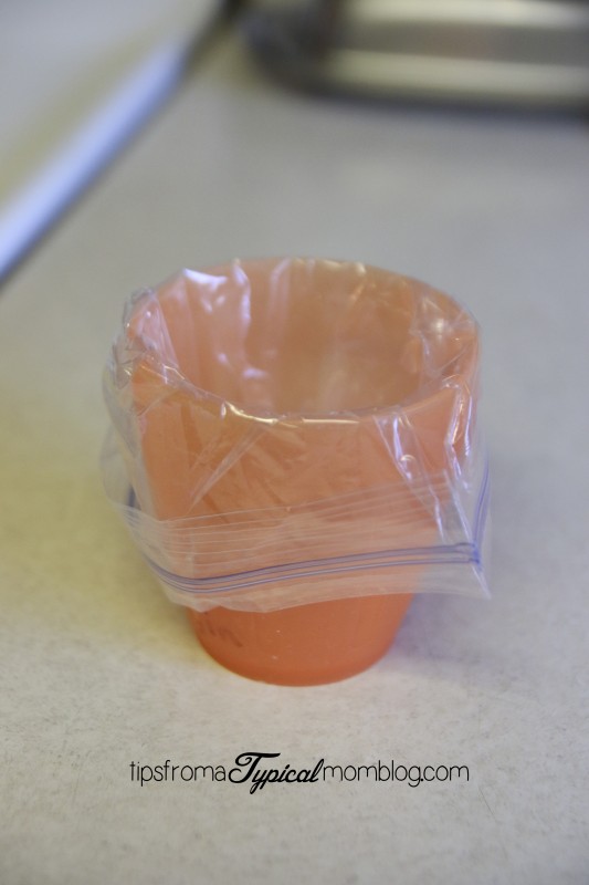 Put a sandwich size baggie into a small cup like so: