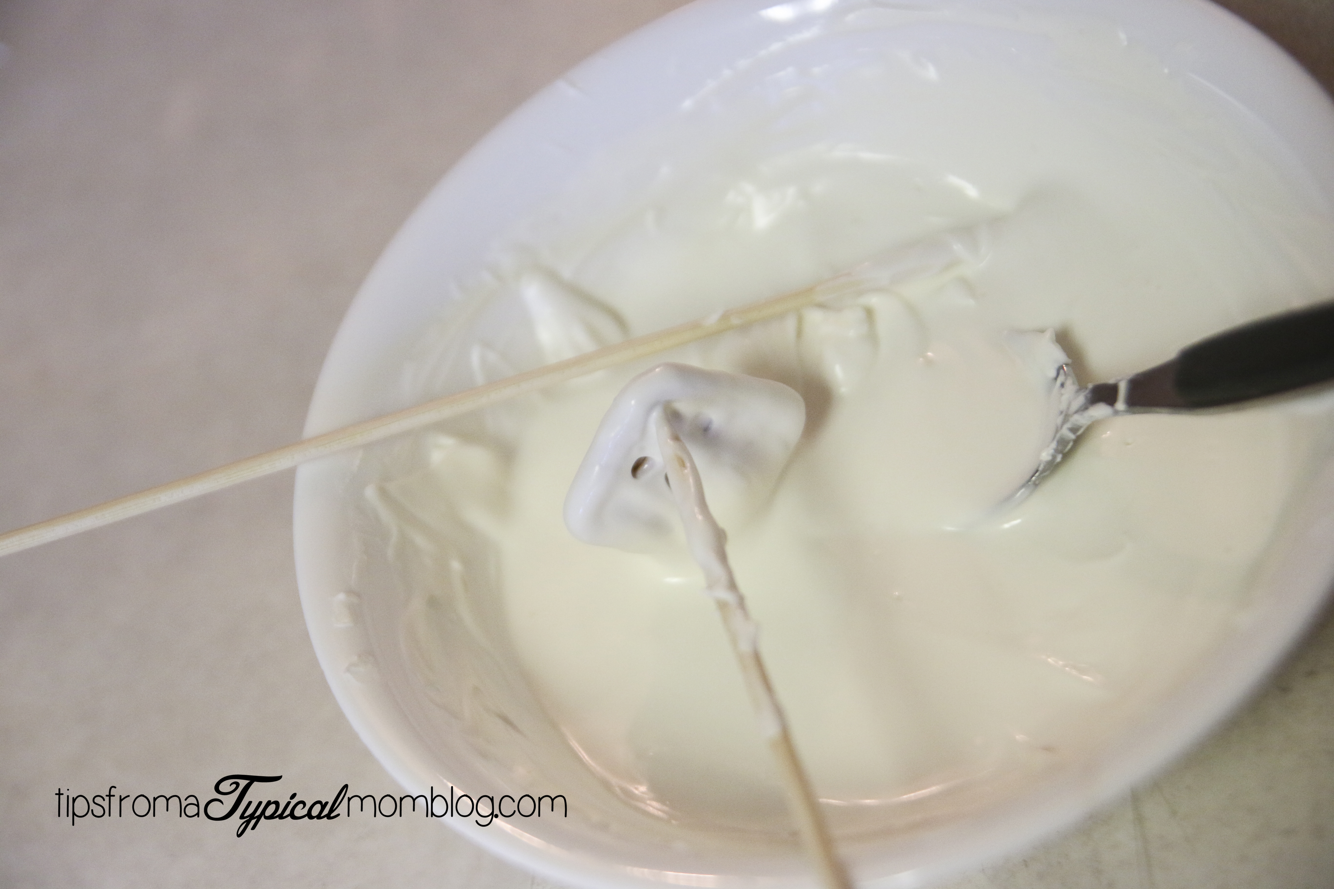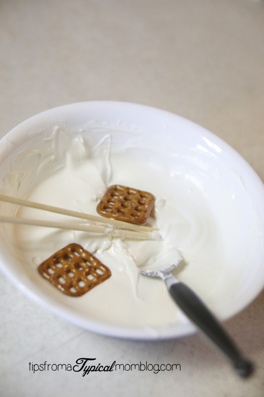 Using two bamboo skewers or toothpicks, start dipping the pretzels in the white candy melts. Pull out and scrape off the excess with the other skewer.