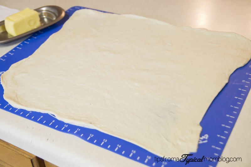 Start by rolling out your dough into a large rectangle. I use my non stick mat so I don’t have to use extra flour. If you don’t have a non stick mat, use wax paper or flour. Rolling out a 19″ rectangle will make 9 cinnamon rolls to fit in a 9×9 pan.