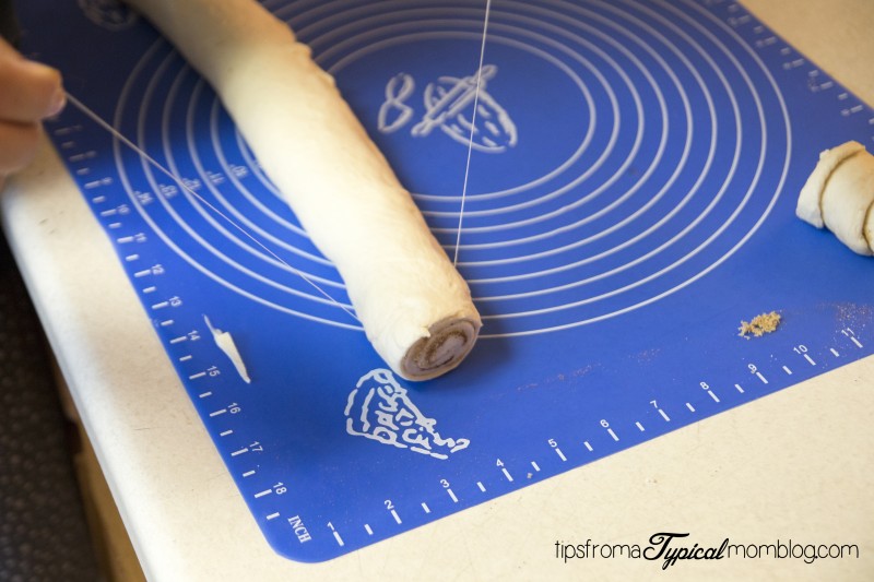Now here is the second trick I’m going to teach you. Get out your sewing kit, yes you heard me, sewing kit, and get out some thread. Wiggle the thread under the roll and cross it over itself. Pull tightly through the dough and the thread slices the dough. Yay! No more knifes getting stuck in the sticky dough or cutting my silicone mat.