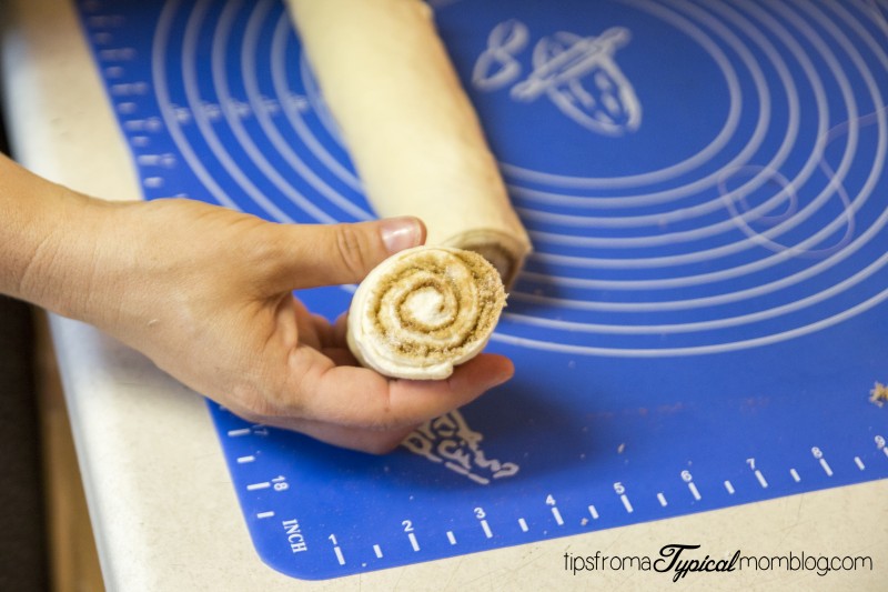 Yay! No more knifes getting stuck in the sticky dough or cutting my silicone mat. I cut the ends off of the roll, then I cut every 2 ” to make 9 rolls.