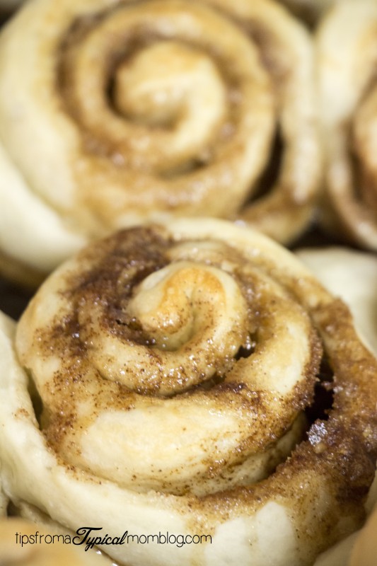 When the rolls have risen enough, preheat oven to 350 degrees. Bake for about 30-40 minutes or until middle is set and they are starting to turn a golden brown.