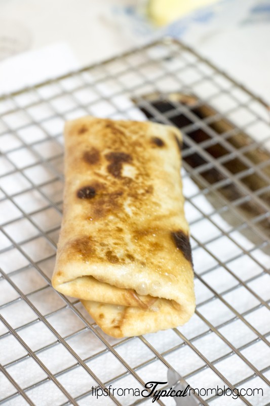 Let rest for a minute, then with two forks, roll in the cinnamon sugar mixture. Don’t wait too long to roll in the sugar mixture or it won’t stick to the tortilla.