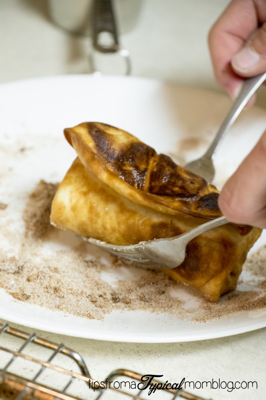 Continue with the rest of the fruit and tortillas. Add the sugar and cinnamon to a large plate and mix and spread evenly over the plate. Cook chimichangas in hot oil turning with tongs when browned.