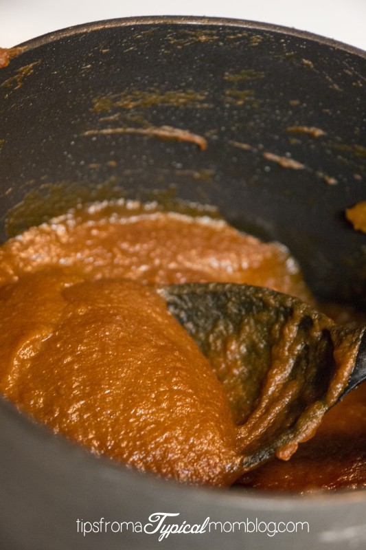 Melt butter in a saucepan over medium heat. Stir in brown sugar until it dissolves with the butter. Stir in the pumpkin and the spices. Continue to stir over medium heat for 10 min. Remove from heat and let cool a little.