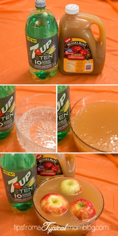 Another fun thing that could be made with these ingredients is Apple Bobbing Punch. Just get out your punch bowl and add half and half 7Up and Spiced Apple Cider. Add 3 large clean apples to the punch to make it look like an apple bobbing game.