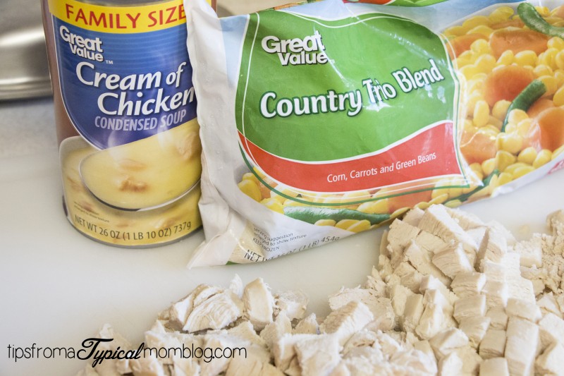 Preheat oven to 375 degrees. If your chicken isn’t already cooked, boil it in water with salt for about 30 minutes until cooked all the way through. Cut into bite size pieces. Mix the chicken with the soup and vegetables in a large bowl and set aside.