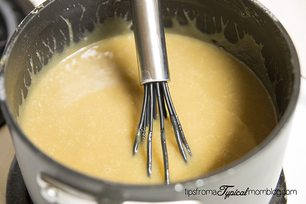 - Add and mix sugar, corn syrup and condensed milk.