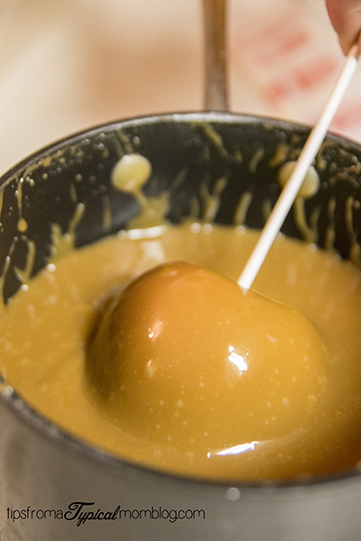 Making homemade caramel apples is one of our family traditions every Fall. We love making this caramel recipe and using the leftovers for giving to friends and neighbors. This is definitely something that needs CLOSE adult supervision because of how hot the caramel is, but you can help the kids dip their own apples and put what ever toppings they want on them.