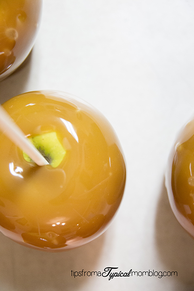 - Quickly set on the parchment paper. Continue with each apple. Let the apples sit until completely cooled and hardened. About 45 minutes. We like to serve ours cut up.