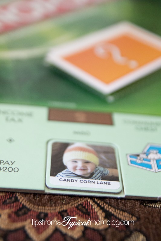 The board comes with little tiles that can be customized. You don’t have to use the boring old street names anymore, you can name your own streets. Like “Candy Corn Lane” seen below with my little one wearing the Candy Corn hat I made him 🙂