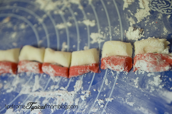 On a work surface, sprinkle more powdered sugar to keep the dough from sticking. Make a long “snake” out of both colors of dough side by side and cut them into pieces, about an inch long.