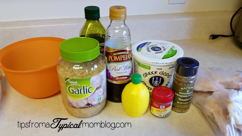 - In a mixing bowl, whisk together olive oil, lemon juice, Greek yogurt, red wine vinegar, onion salt, garlic, oregano, thyme and season with freshly ground black pepper to taste. Place chicken in a gallon ziploc bag, pour marinade over chicken and seal bag. Press out excess air and put in refrigerator to marinate 2 - 4 hours. Brush grill with olive oil and preheat over medium high heat. Once the grill is hot, cook the chicken for about 7 minutes on each side or until an internal thermometer reads 165 degrees. Remove from the grill. Allow to rest 10 minutes and slice into strips.