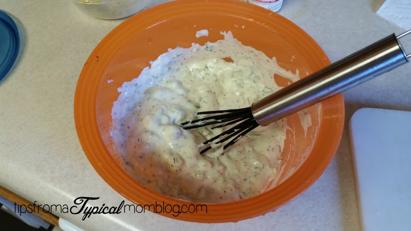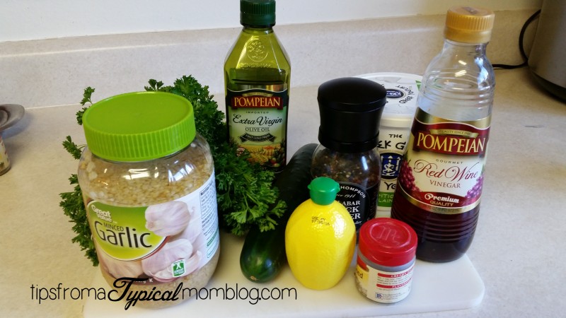 - Place the cucumber in a small bowl. Add Greek yogurt, garlic, lemon juice, olive oil, red wine vinegar, parsley, and dill and season with salt and pepper to taste. Whisk together. Store in refrigerator in an airtight container up to 3 days.