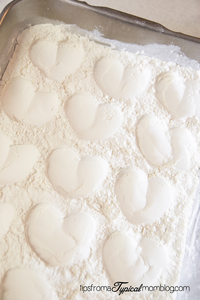 - Using a teaspoon, scoop the marshmallow mixture out and twirl the threads around the spoon with your finger. Pour into the flour molds and continue until all molds are full. Let sit for at least 3 hours or over night to set up. When the marshmallow is set up, flip them over in the flour so they are not sticky. If any of the molds mad the hearts look weird, you can trim them with WET scissors.