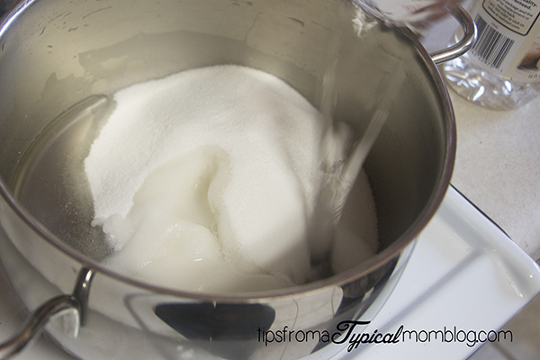In medium sauce pan, stir the sugar, corn syrup and water (or cherry juice) together.