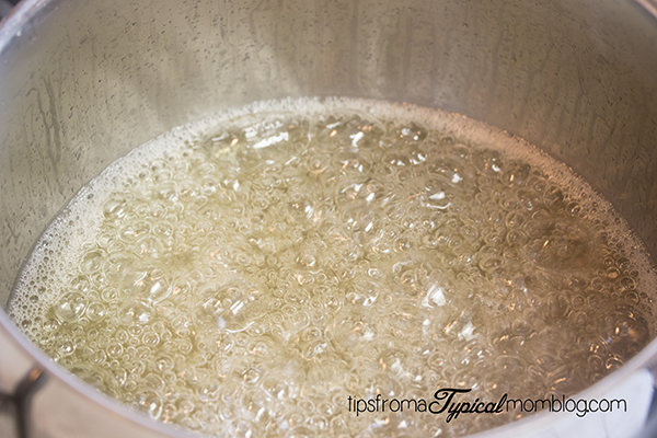 Turn on the burner to medium high and cook the mixture until the soft ball stage on a candy thermometer. DO NOT STIR the mixture at all while cooking. Once it is boiling, cover it with a lid.