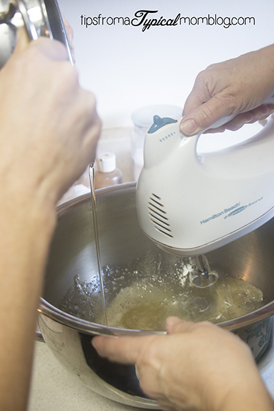 If you over cook it, just add a little bit of water to soften it up a bit. In a large stainless steel bowl (or the bowl of your stand mixture), add the gelatin mixture and turn on the beaters of a hand mixer (or the whisk on your stand mixer) and slowly pour the hot candy mixture into the gelatin. This is not a job for the kids! Whip until stiff, cool and very white and fluffy.