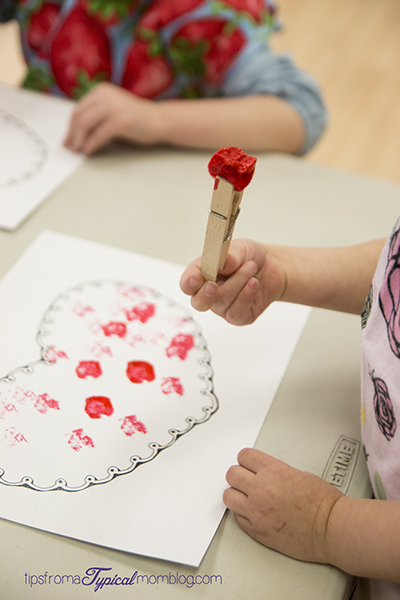 […] 9. Let your kiddo paint using pom poms and clothes pins! Check out this Valentine Pom Pom Painting by tipsfromatypicalmomblog. […]