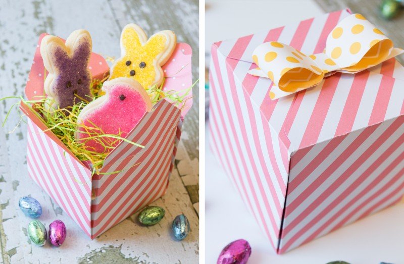Now fill it with treats and you’re done. Unless you want a super cute paper bow to put on top! (Do you love those Easter Peeps Sugar Cookies? Get the recipe HERE.)