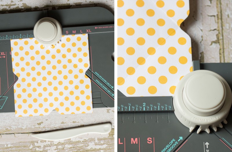 Score and punch the paper according to the directions on the board. You will measure, punch, score (with included bone tool), turn 90 degrees counterclockwise, then repeat 4 times.