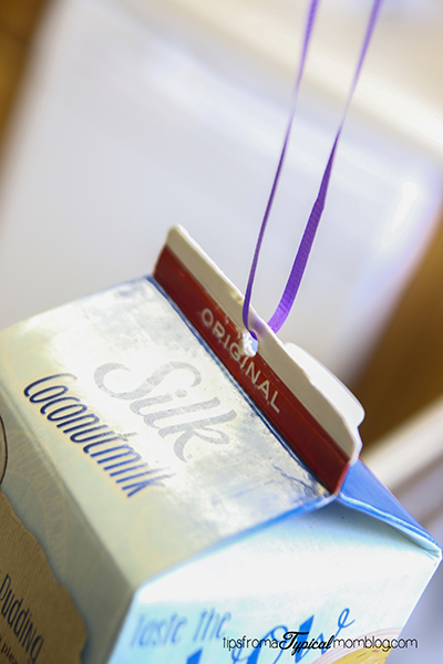 Punch a hole in the top of the carton and thread a length of twine through it. Make the length of twine suitable for the location where you plan to hang your feeder.